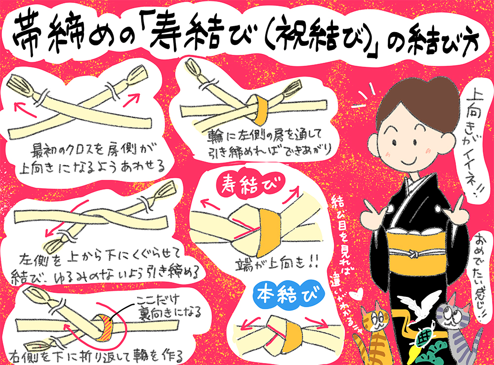 こうしなくてはならないというルールがあるわけではないですが、帯の飾り結びなどと同じように、お祝いの時に「寿結びです」というのはおめでたい感じがしていいですね。