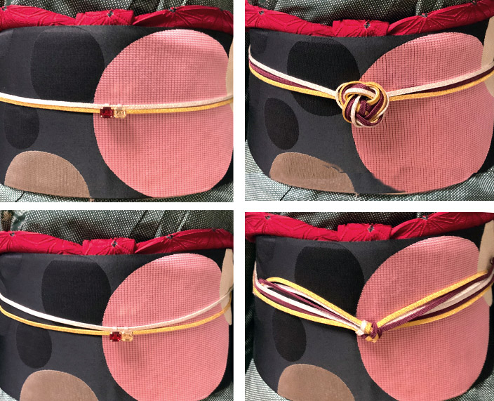 普通に平組の帯締めを本結びにすると、房の付いている先が下向きになるのですが、この「寿結び」をすると上向きになって、水引の祝い結びのように縁起がよいということで、最近好まれているようです。
