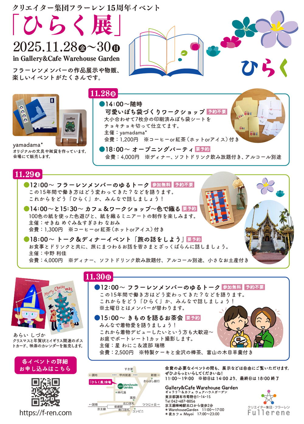 私の着物生活を語る時、キモトモ(着物友達)の存在は欠かせません。中でも一番密に着物に関して一緒になんやかんやとやっているのが、「昭和な家スタジオ」という和装記念写真館を一緒に運営しているカメラマンの渡部瑞穂ちゃん。このコラムにも、拙著にも数えきれないくらい登場していますし、このコラムで使っている写真も彼女が撮ってくれたものがたくさんあります。着物雑誌『月刊アレコレ』の写真撮影も、ほとんど担当している着物大好きカメラマンです。 彼女は大学の同級生で、語学も専修も同じクラスでした。でも学生時代はさほど仲がよかったわけではなかった(笑)のですが、卒業後15年ほど経ってからSNS(mixi)で再会。彼女のプロフィールに着物が趣味、と書いてあったため、着物好きだった私は連絡をとってみたのです。それが2006年のことでした。 もしプロフィールに着物のことがなかったら、連絡はしなかったかもしれない、くらいの状態から、着物を媒介に一気にあれこれ連絡をとりあうように。また、ちょうど子育て世代だったこともあってワーキングマザーの会『ムギ畑』にも誘ってくれて、入会しました。 もともと幹事体質でマメな瑞穂ちゃん、面倒くさがりで自分からは滅多に連絡もしないような私に、着物や育児、仕事のあれこれまでなんやかやと声をかけてくれ、やがて一緒に古民家を借りて着物を着て記念写真を撮るスタジオを運営することに。仕事だけじゃなく、習い事や趣味、子育てとなんだかんだと一緒にずっとつきあってもらっています。 ちょっと個人的な話で恐縮ですが(個人的でなかったことはあるのかという話はさておき)、ちょうどこのスタジオを始めるころ、私はアルコール依存症になってしまった夫(これまた大学の同級生で瑞穂ちゃんとも同じクラス)と揉めまくって離婚することになってしまうわけですが、そんな時にもそのスタジオの仕事と、このコラムの仕事は続けさせてもらっていて、それが心の支えでした。そのほかにも、着物のイラストの仕事やアドバイザーの仕事などでなんとかやってきたってわけです。 この間、大学生になった息子に「母さんはいろいろ仕事をやっているけど、撮影の仕事は喜んでもらえて本当に意義のあるいい仕事だよね」と言ってもらってなんか胸熱でした。 急に身の上話とかしだして、どうした??? と思われたかもですが、、そんなみずほちゃんと『ムギ畑』で知り合ったクリエイターの仲間たちとチームを組んで仕事をしてきた「フラーレン」というグループが今年15周年を迎えます。このグループに参加した頃はまだ、こんな人生を歩むとは思ってもいなかったのですけれど、気がついたらあっという間の15年でした。 チームといっても、それぞれが独立したフリーランスのクリエイターであり、ゆるく連携をとっている、というかんじなのですが、フリーランスでの仕事というのは基本一人なので、そんなとき同じように子育てをしながら仕事をしている女性たちに、助けてもらったり愚痴を聞いてもらったりできたこの環境は本当にありがたく、なんとか生きてこられた縁のひとつです。みんなには感謝しかありません。 これも、瑞穂ちゃんが「着物が趣味」とプロフィールに書いていなかったら、始まらなかったご縁かも?と思うと、着物よありがとう、と心から思うのでありました。 そんなクリエイター集団フラーレン15周年イベント「ひらく展」が京王線柴崎駅のギャラリーカフェ Gallery&Cafe Warehouse Garden で11月末に開催されます。私と瑞穂ちゃんは、11月30日に「きものを語るお茶会」を担当します。瑞穂ちゃんによるポートレート撮影つきです。着物がつないでくれた二人の着物愛炸裂のお茶会になること間違いなしなので、もしよかったらいらしてくださいませ。 ほかにも素敵なギャラリーカフェでいろいろなワークショップがあります。興味のある方、ぜひ参加してみてくださいね! 宣伝失礼いたしました(ぺこり)