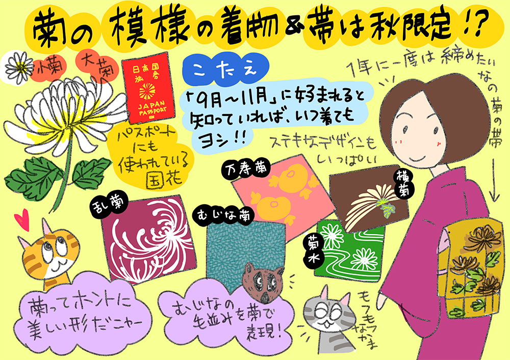 毎年秋になると、菊や紅葉の紋様が気になってお出かけの時に着なくっちゃ……とそわそわします。一般的に菊の柄は9月~11月がよいと言われるのですが、重陽の節句はまだまだ暑く、秋だから……という気分になるのが10月も終わる頃。あわてて11月に着ることが多いです。 12月に入ると冬となり、そこからは松・竹・梅、雪輪など冬の意匠に移っていきます。1月に咲く寒菊などもありますし、意匠としての菊であったり、他の季節の花と一緒に描かれているものは季節を気にしなくてもよいですが、「ザ・菊」というデザインだと、やはり秋に好まれるようです。 そして、菊は桜と並んで国花としても愛されています。桜だけかと思っていたんですが、菊もそうだったんですね。そう言われれば皇室の象徴だったり、パスポートにも菊の紋章が付いているなと納得です。 いただきものの色留袖で爽やかな淡い水色に白菊の花がびっしり裾に描かれているものがあるのですが、秋というには色が爽やかすぎてちょっと違和感があったのですが、着物の達人に「柄がこうだから、と決めつけないで、全体の雰囲気で考えればいいのよ」と言われました。 帯に四季の花があれば、菊だけを見て秋、と思わないし、コーディネートでも工夫ができそうです。「菊は秋の花」という季節感覚はベースにありつつ、応用をしていくという感じでしょうか。 「四君子」という蘭、竹、菊、梅の4種類の植物を組み合わせる吉祥柄もありますし、梅に何が組み合わされているかというようなところからデザインの意図を汲むのもわくわくするものです。 季節の柄を楽しむというようなシーンでは、絶対的な正解がある、というよりは、自分の中に答えがあって納得していればいいし、さらに「なるほど」とわかってくれる人がいれば尚更楽しいというものではないかなと。 さて話を戻すと、意匠としての菊には「不老長寿」「信頼」「高貴」「邪気を払う」などの意味があり、その凛とした拡張高い美しさは古来から愛されてきました。秋を表すだけでなく、めでたい柄としてたくさん使われています。 格調高いし、仏花にも使われたり、あまりにも和柄のスタンダードすぎてなんとなく敬遠していた時期もありますが、最近また温故知新といいますか、好きになってきました。 乱菊、万寿菊、菊水、菊尽くし、むじな菊、菊唐草、横菊などなど、美しい菊のデザインをいろんなところで見たことがあると思います。 私はむじな菊の紋様が大好きです。江戸小紋でもある柄ですが、むじな(ニホンアナグマ)の毛並みのように菊の花びらを表現したもので、なんともいえず柔らかくてほんわかした気持ちになります。もふもふ感……。 乱菊は大胆でかっこいいし、万寿菊はまんまるでお饅頭みたいで可愛いし、菊が描いてあるから秋、なんていうと着る着物がないのでは?と思うくらい、花としていろんなところにあしらわれています。花びらが多く華やかですし、葉の形も特徴的で美しい形をしている菊。洋服ではあまり見かけませんが、着物では本当にポピュラーな柄です。ポピュラーすぎて見過ごしていることもあるかもしれません。 お手持ちの着物にも探せばきっとあちこちに菊が描かれているはず。秋にしか着られない、のではなく、秋だから身につけたら楽しい、と考えてコーディネートにぜひ取り入れてみてはいかがでしょうか?