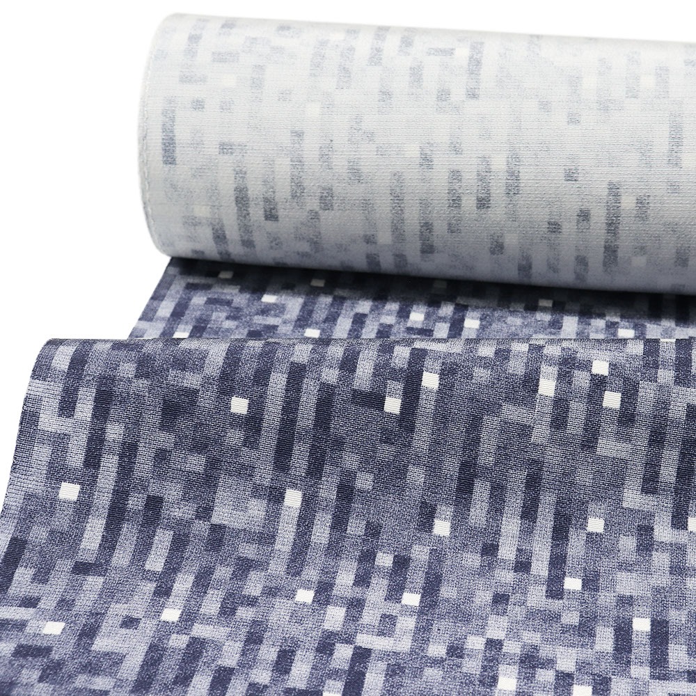 なめらかな正絹地に、色の濃淡に変化をつけてモザイク模様を染めた一本。落ち着いた黒と、幾何学的な模様がモダンな雰囲気漂う洒落小紋です。