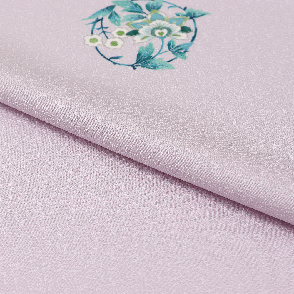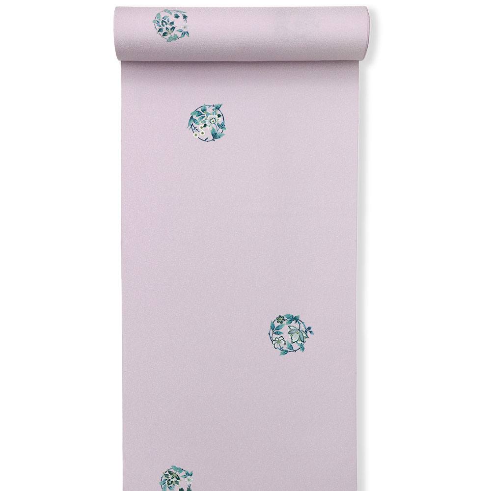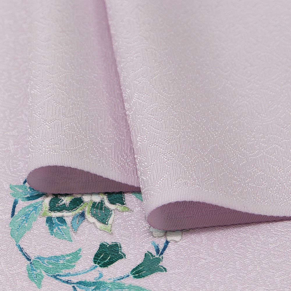 細やかな唐草地紋を織り出した藤色の地に、銀彩で縁取った飛び柄の唐草模様が華やかな一枚。藤色の柔らかな色合いと、飛び柄、地紋などが溶け合い、優しく気品あふれる着姿を演出します。