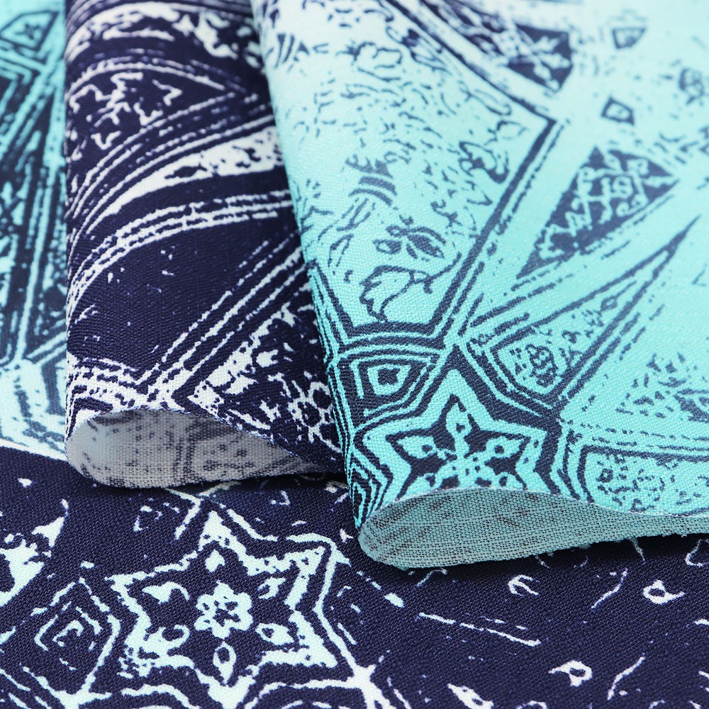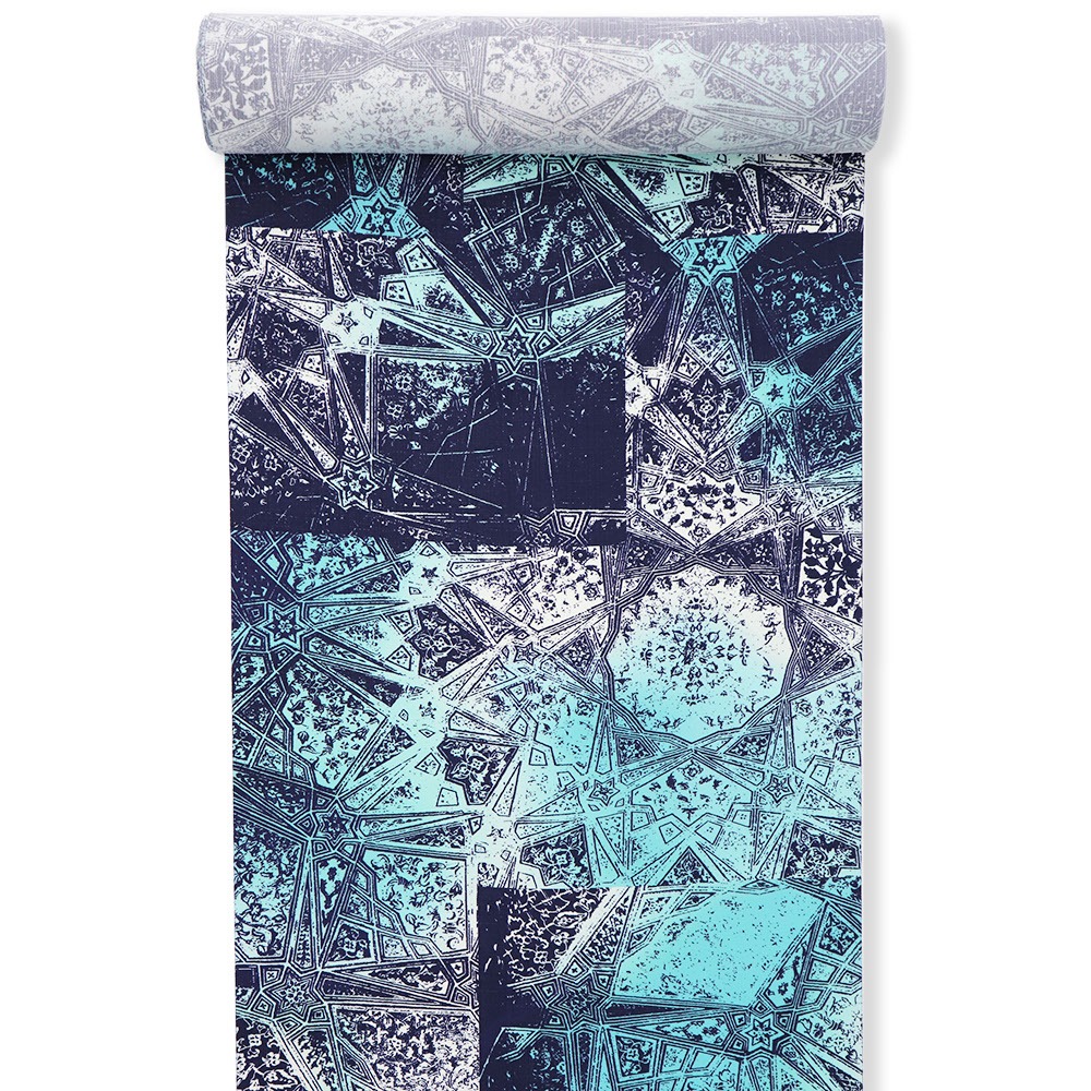 「ウォールアート」と名付けられたこちらの小紋は、2025年の新作デザイン。その名の通り壁面アートがモチーフに、鮮やかなブルーとグリーンが複雑に混ざり合いユニークな着姿を表現します。