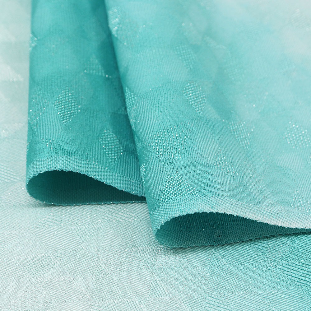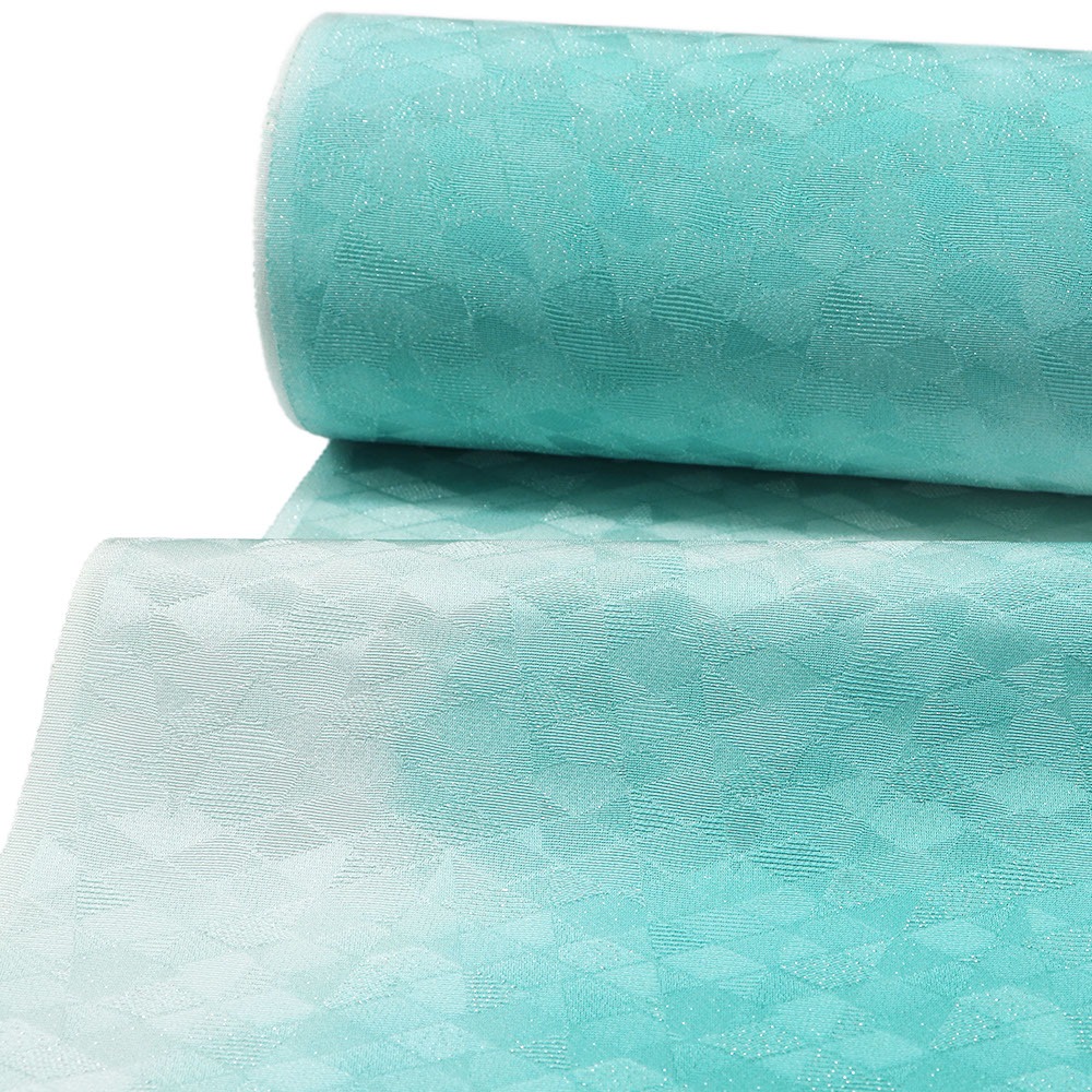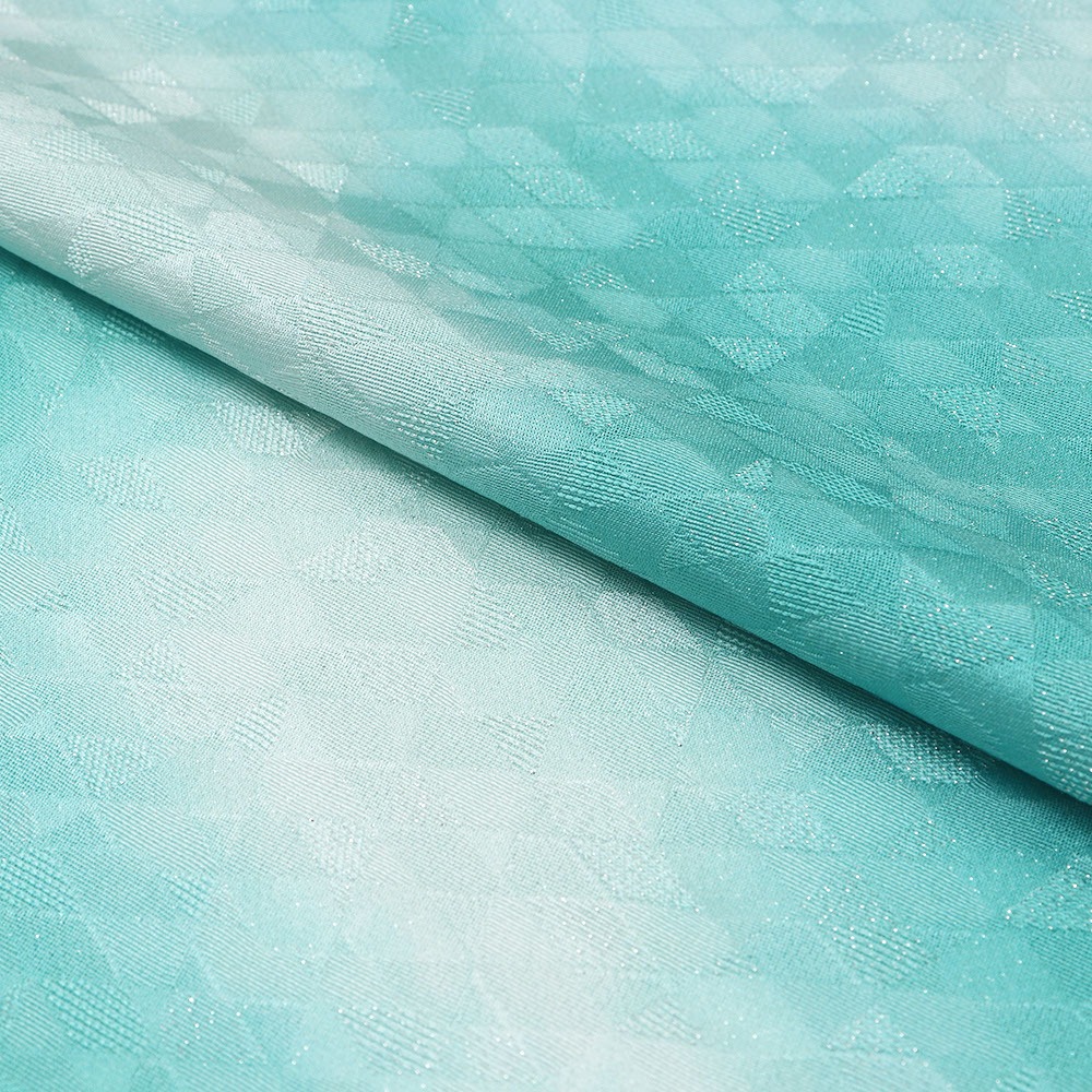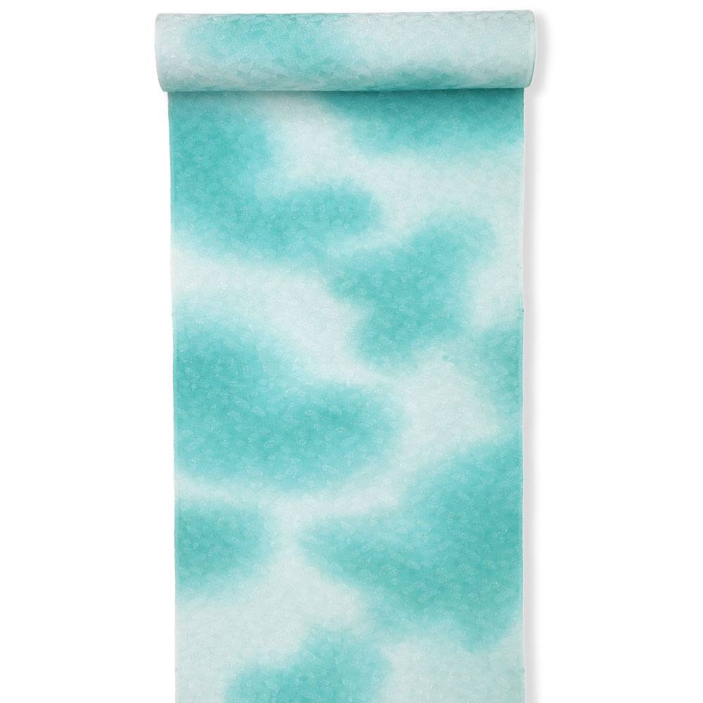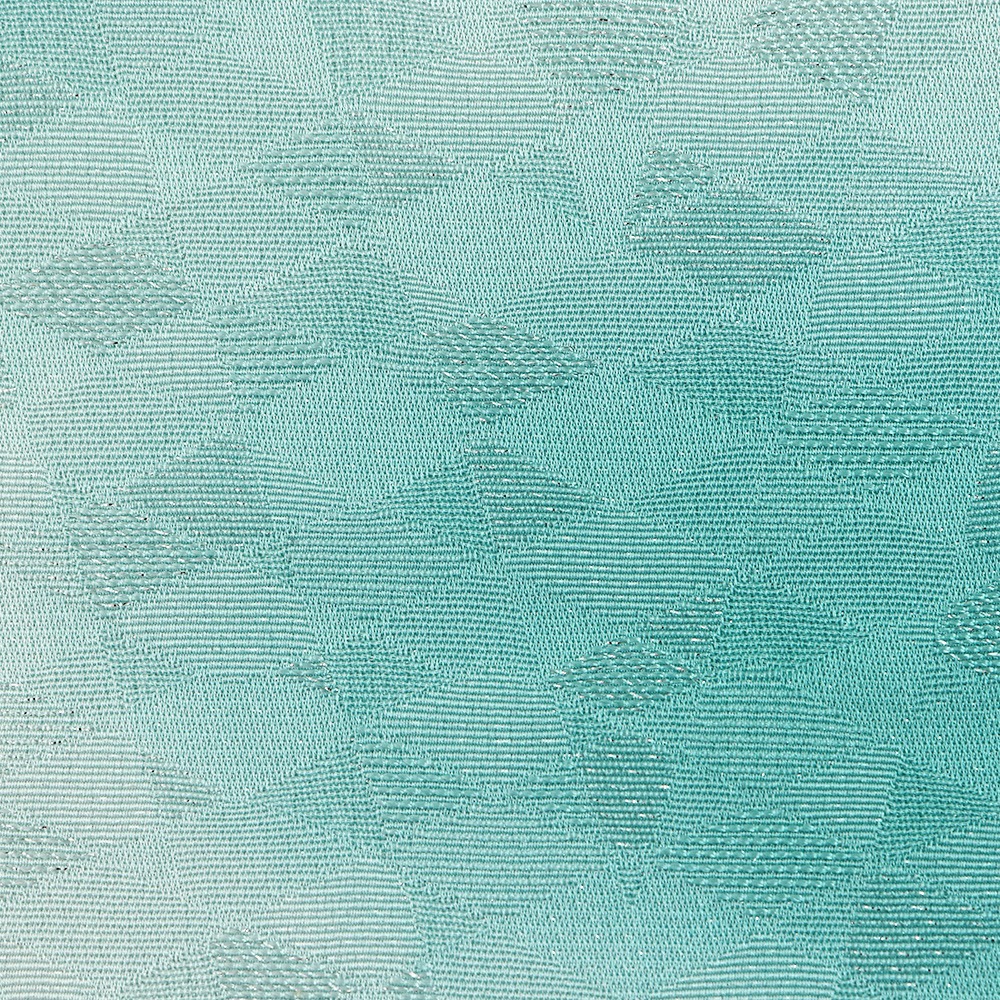 反物全体に織り出された菱取り地紋に沿って織り込まれた箔糸は、体の動きに合わせてキラキラと輝き、表情豊かな着姿に。青緑のぼかし模様がタイダイ染めのようなポップな雰囲気を与えてくれ、華やかさと爽やかさが同居する仕上がりになっています。