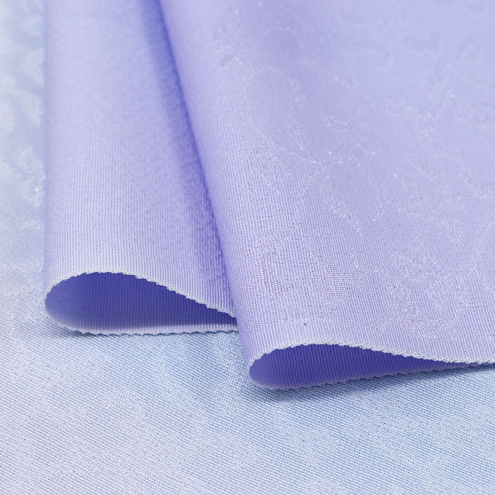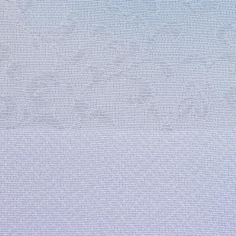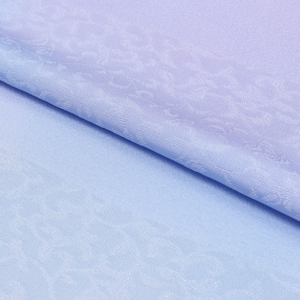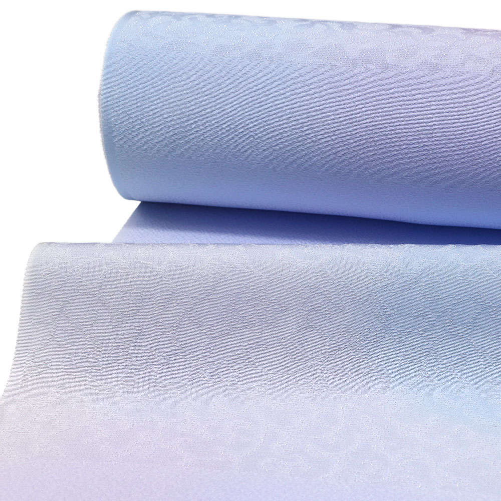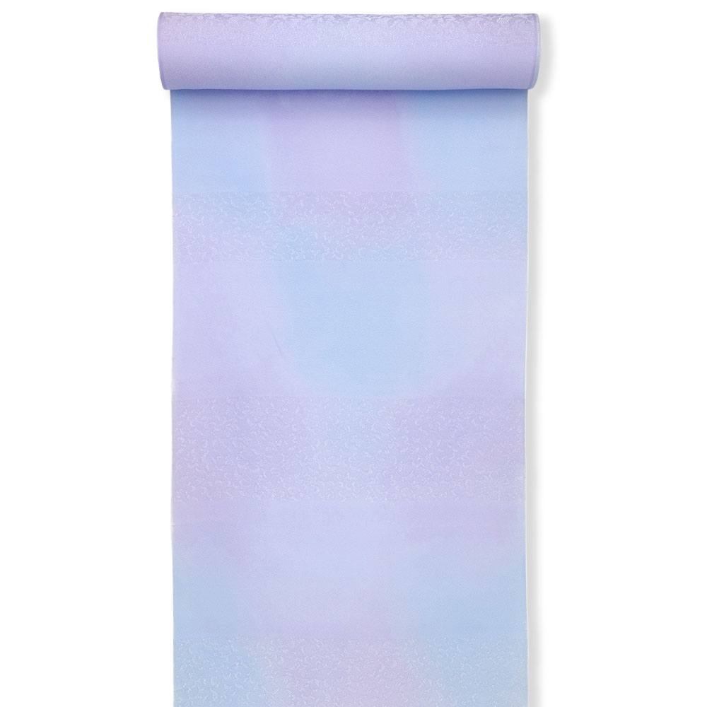 反物全体に織り出された横段唐草の地に沿って織り込まれた箔糸は、体の動きに合わせてキラキラと輝き、表情豊かな着姿に。青藤色のぼかし模様が華やかさの中に繊細な奥行きを与えてくれます。