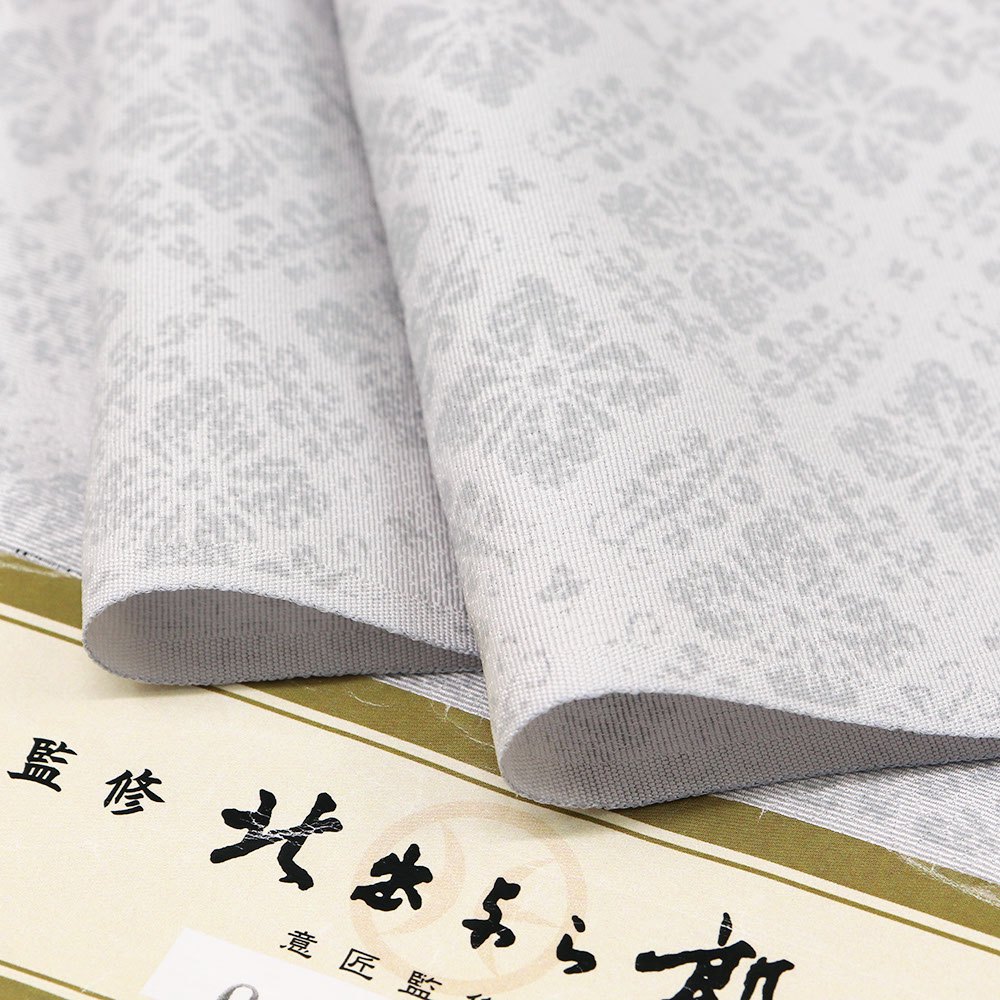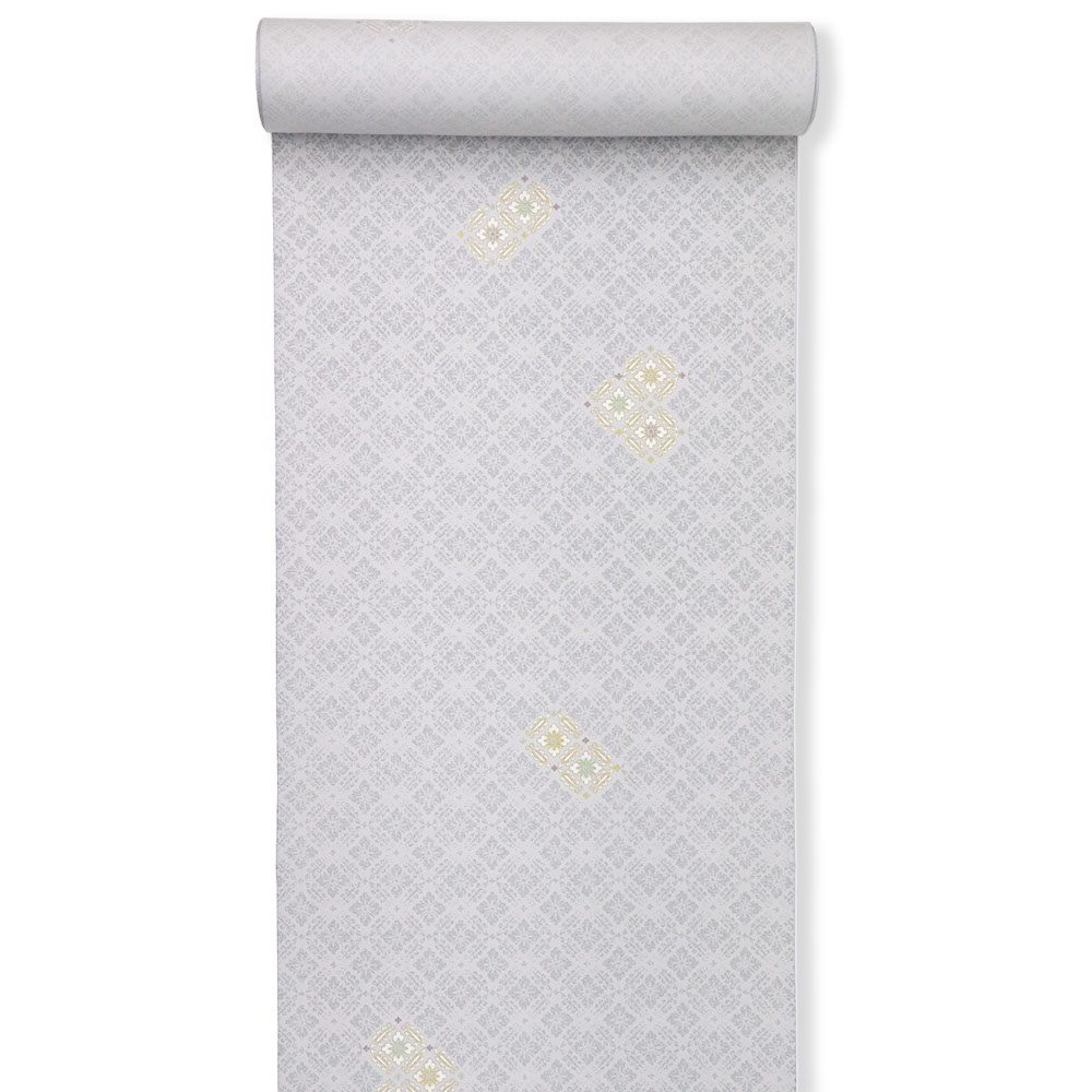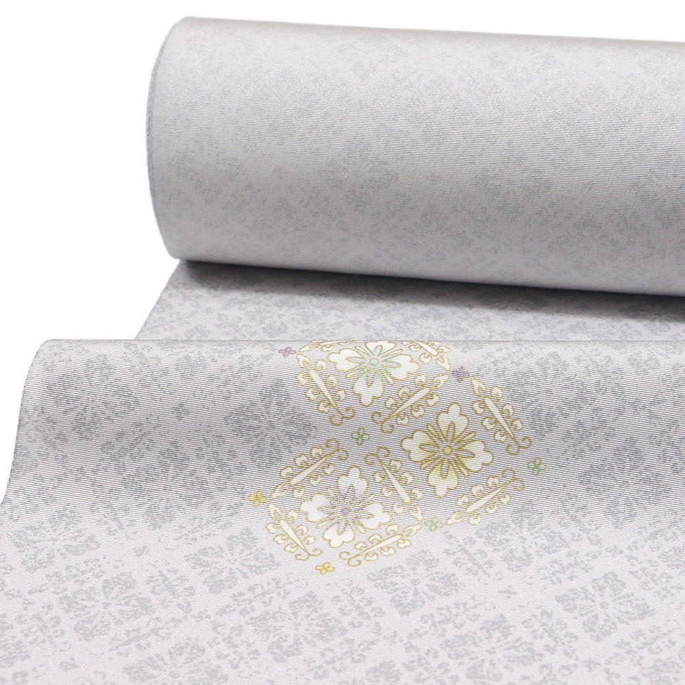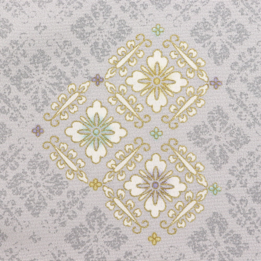 丹後ちりめんの地に、金彩で縁取った飛び柄の花菱が描かれた一枚。薄灰色の柔らかな色合いと地紋、花菱が上品に混ざり合い、優しく気品あふれる「はんなり」とした着姿を演出します。