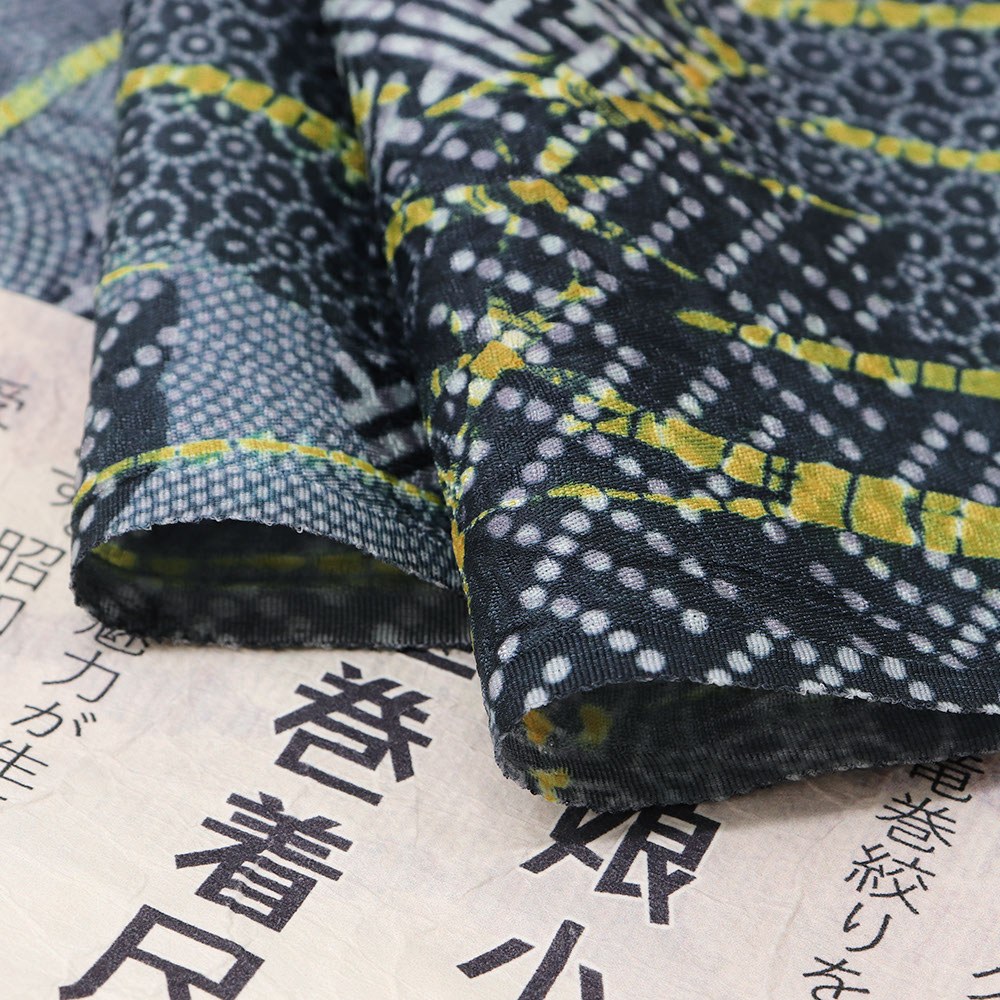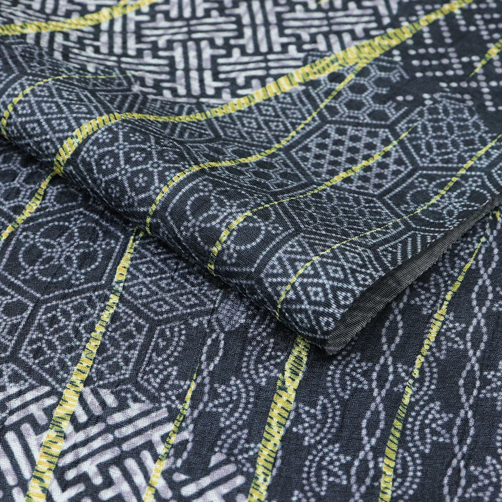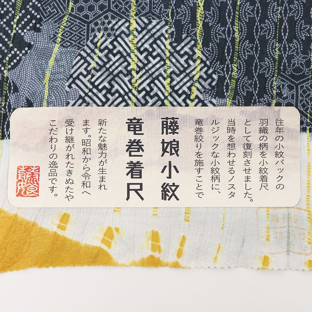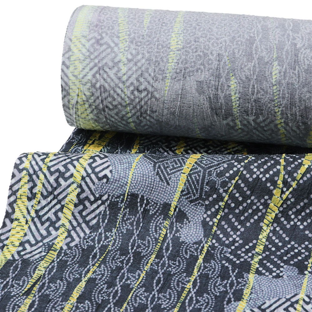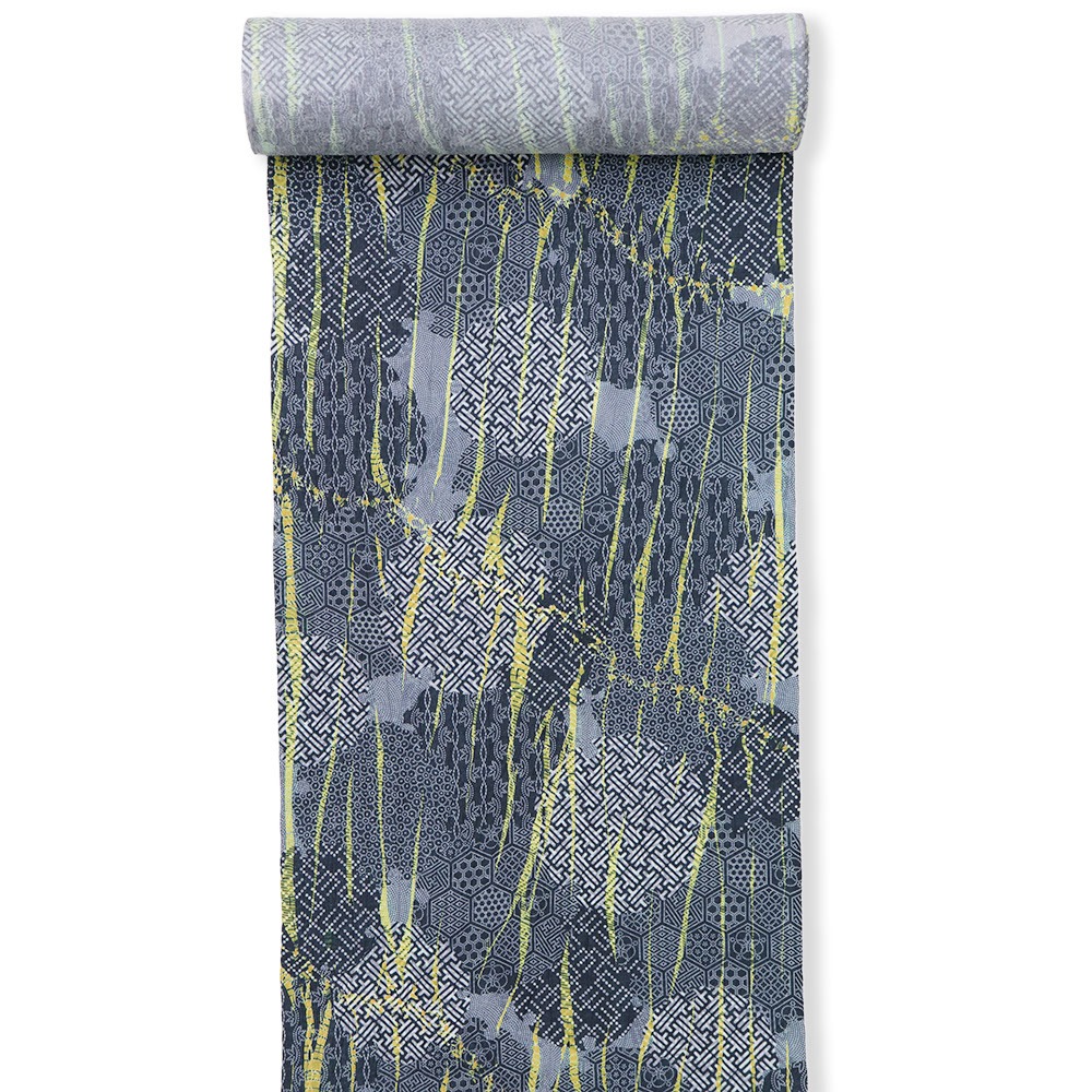 こちらは、細やかな小紋柄を雪輪で枠取りした柄の上から、生地全体に竜巻絞りを施した一本。落ち着いた青灰色にビビットな黄色を足すことで、唯一無二なモダンデザインが生まれています。