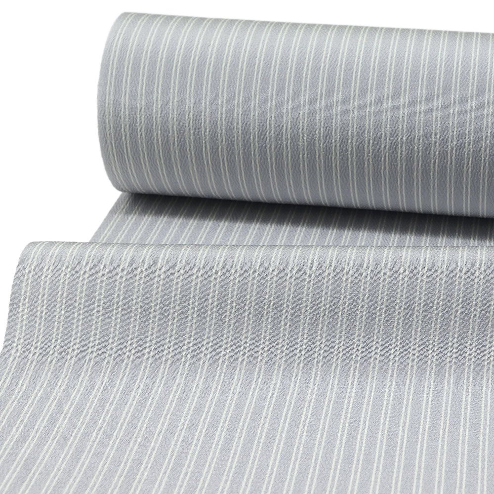 金通縞を満遍なく織り上げたこちらは、淡い色彩が優し気な雰囲気を醸し出す一本。御召ならではの光沢はさりげなく、少しシボだった風合いあふれる生地がモダンな着姿を演出します。