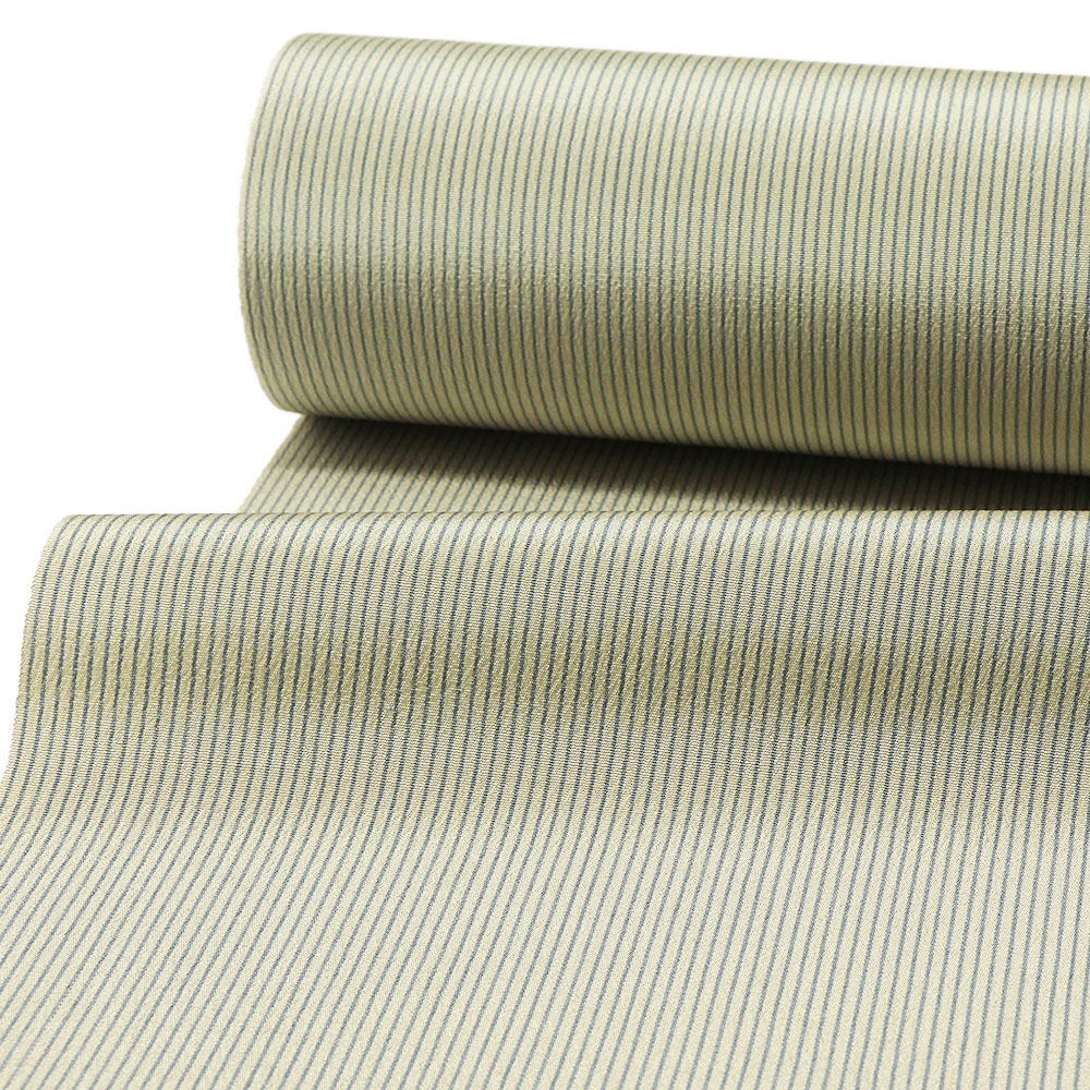 縞模様を満遍なく織り上げたこちらは、淡い色彩が優し気な雰囲気を醸し出す一本。御召ならではの光沢はさりげなく、少しシボだった風合いあふれる生地がモダンな着姿を演出します。