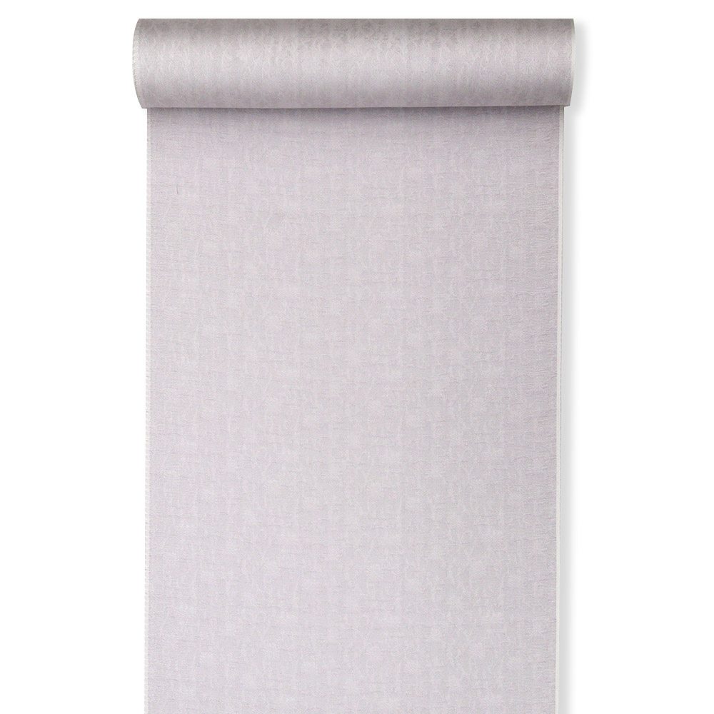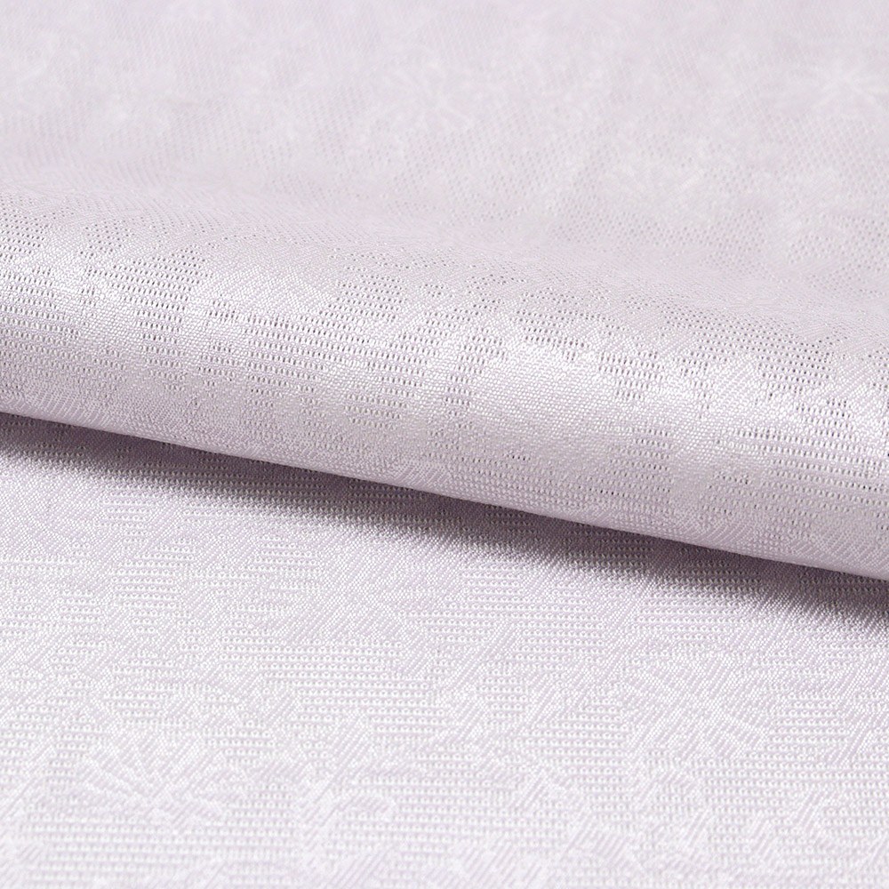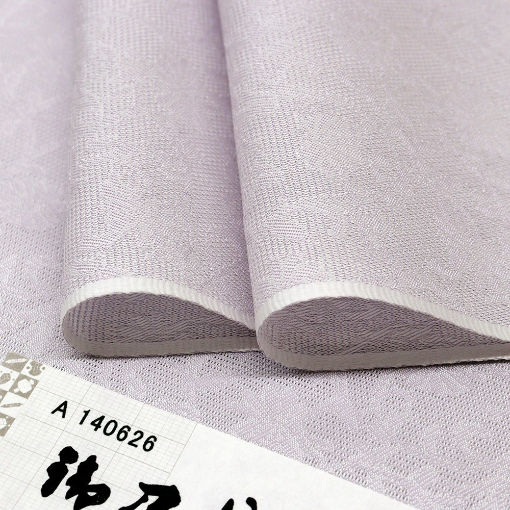 小さな唐花模様を織りだした上品な一枚。淡い藤色が女性的な柔らかさを演出する、美しい配色です。