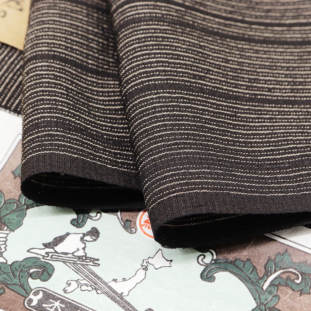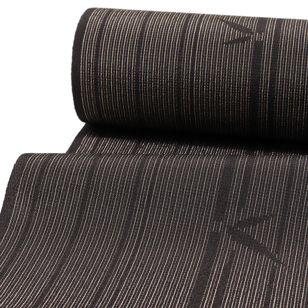 シャリ感のある本しぼ絣に、伝統的技法「柿渋染め」を使用した職人技の一本。しぼの柔らかな風合いに、植物染めならではの色合いが着姿を優しく包んでくれます。定番の縞模様は竹縞なのでちょっとした装飾性もあり、無地系から総柄まで、様々な帯と似合いそうです。