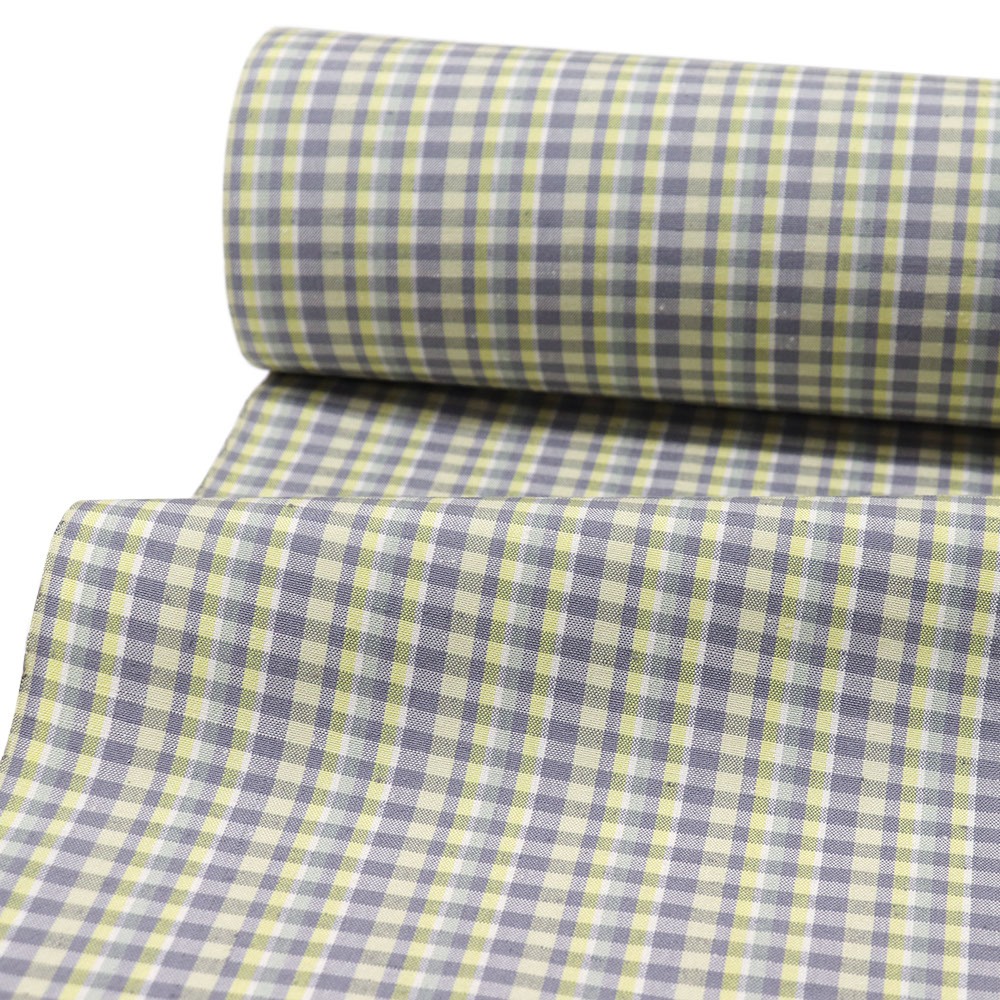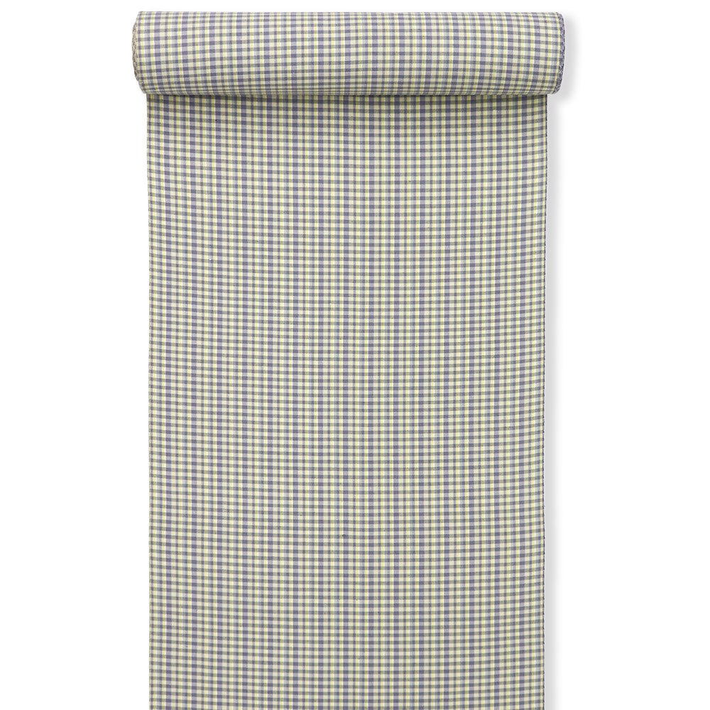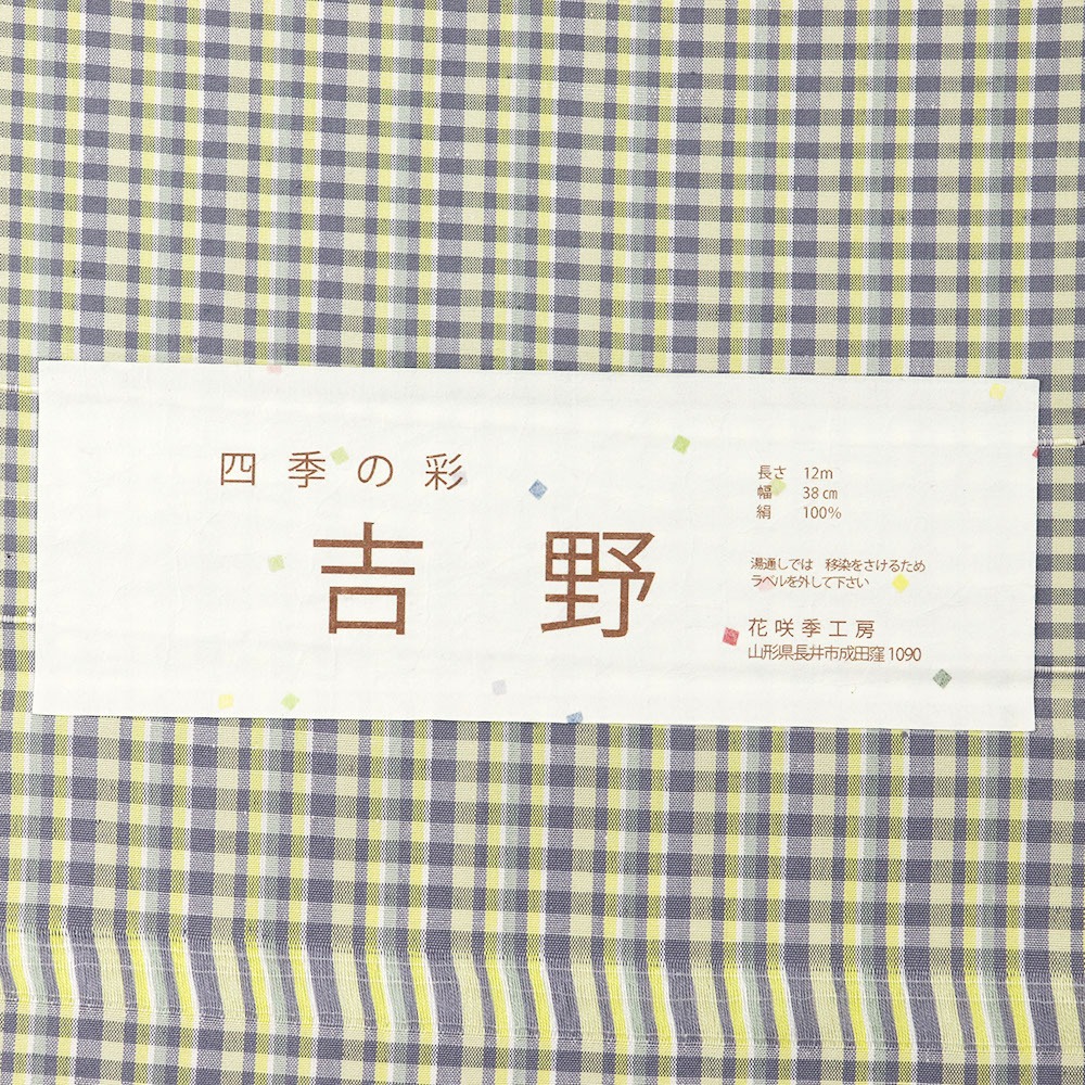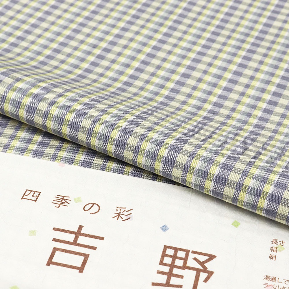 吉野格子をモチーフに、紅花染めならではの穏やかで優しい色合いで、色彩豊かな格子を織り出した一枚。グレー×黄の落ち着いた組み合わせで、時代や流行に左右されず、どの年代の方でもお召しいただける大人な仕上がりになっています。