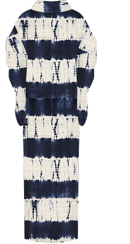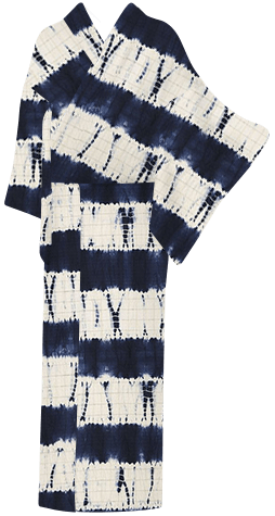 九州南端の鹿児島が生んだ名産・大島紬は、軽いのに冬は暖かく夏は涼しく、それでいて丈夫なため一枚持っていれば孫子の代まで着られる一品。その大島紬生地に、江戸時代に誕生して以来日本の絞りの大半が行われている、愛知・有松鳴海地域の緻密で美しい絞りを施しました。鎧段縫い竜巻絞りで、藍色の横段模様を表現。色のにじみによって現れる濃淡も味わい深い趣です。指定産地の職人によってひとつずつ括り染められているので、同じものはひとつとしてありません。