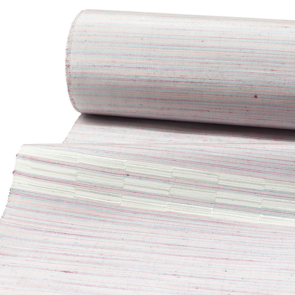 細かな横段部分は遠目からは無地に見え、その上地空きが多いので、色柄を問わずに帯合わせや小物合わせができるのも嬉しいところ。名古屋帯を締めて風情を演出したり、半幅帯を締めて遊び心を出した小粋なオシャレを演出したり、ぜひ普段着やカジュアルなお出かけにお役立てください。