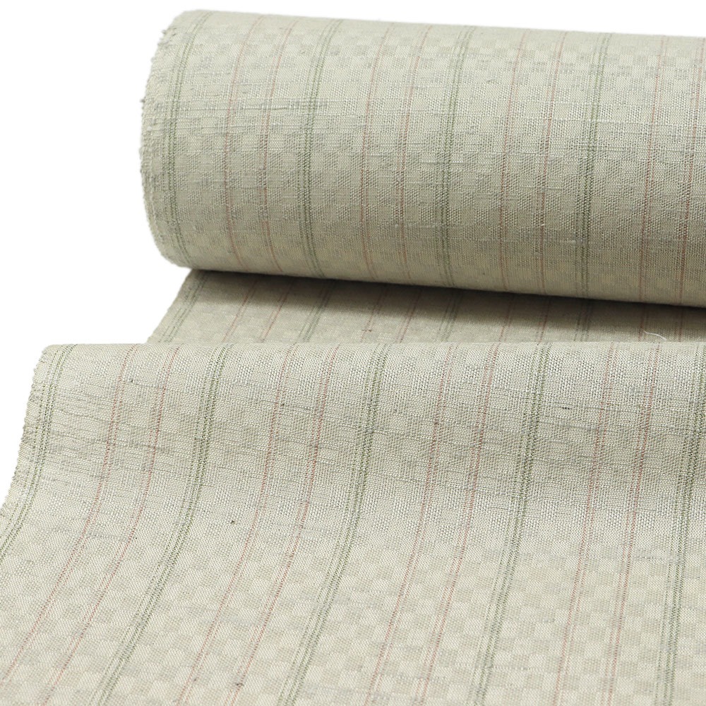 灰白緑色の地に、縞模様を織り出した一枚。紋織という表記通り、地紋には市松模様が緻密に織り出されています。紬ならではの節と優しい風合いに、地紋が生み出す奥行きが、着姿を上品に包みこんでくれるでしょう。