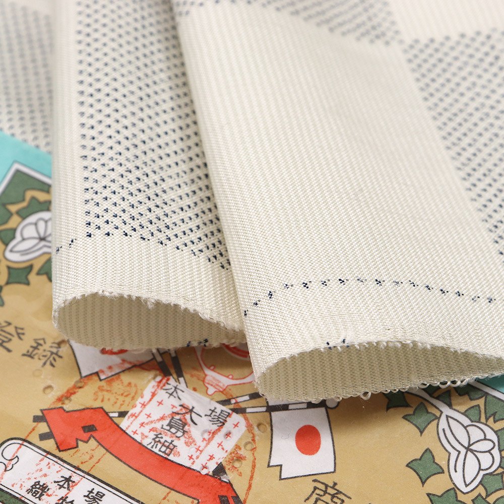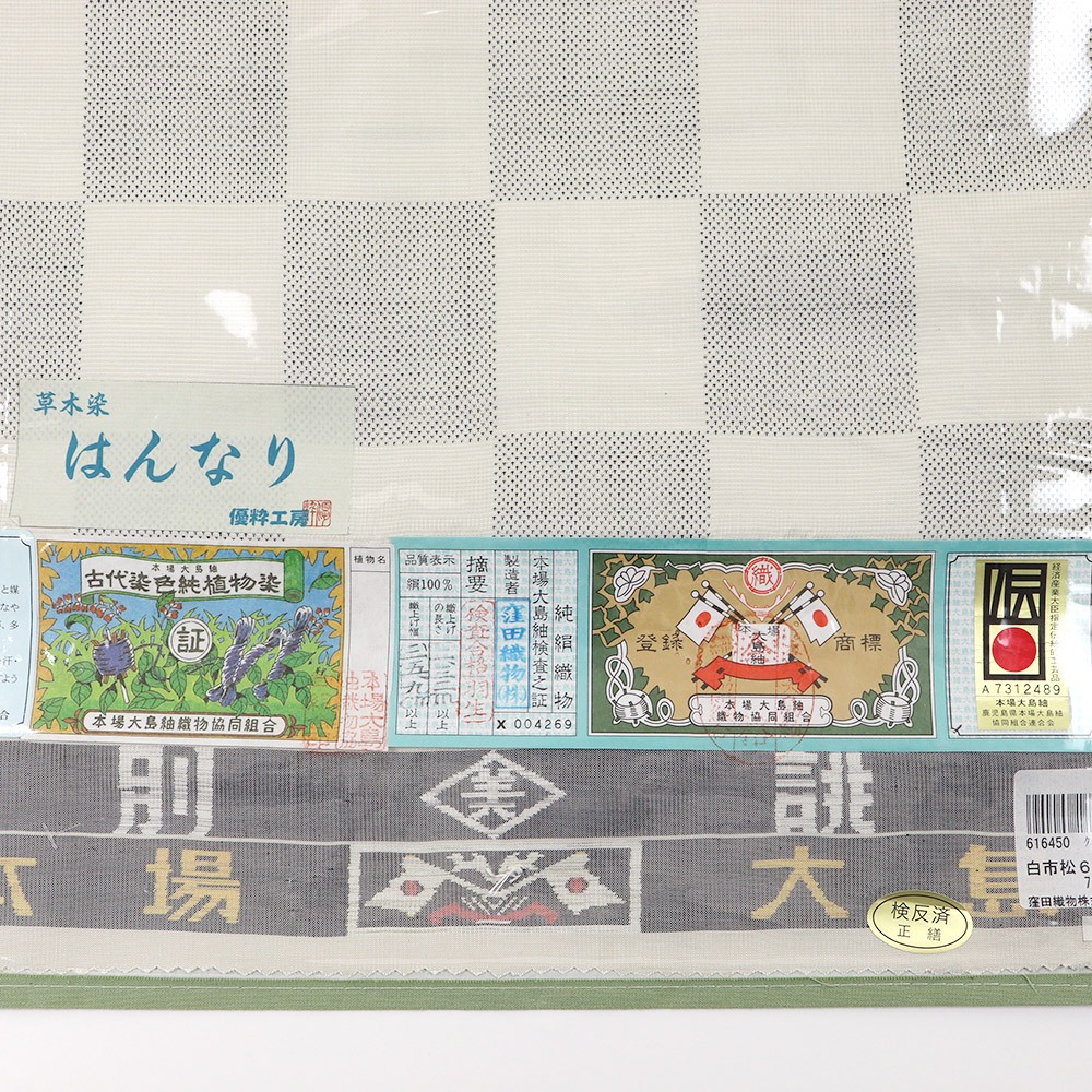 絣糸を使用した大島紬のみ貼られる水色証紙と、手織りであることを証明する伝統工芸マークが貼られた【窪田織物】による白大島紬。