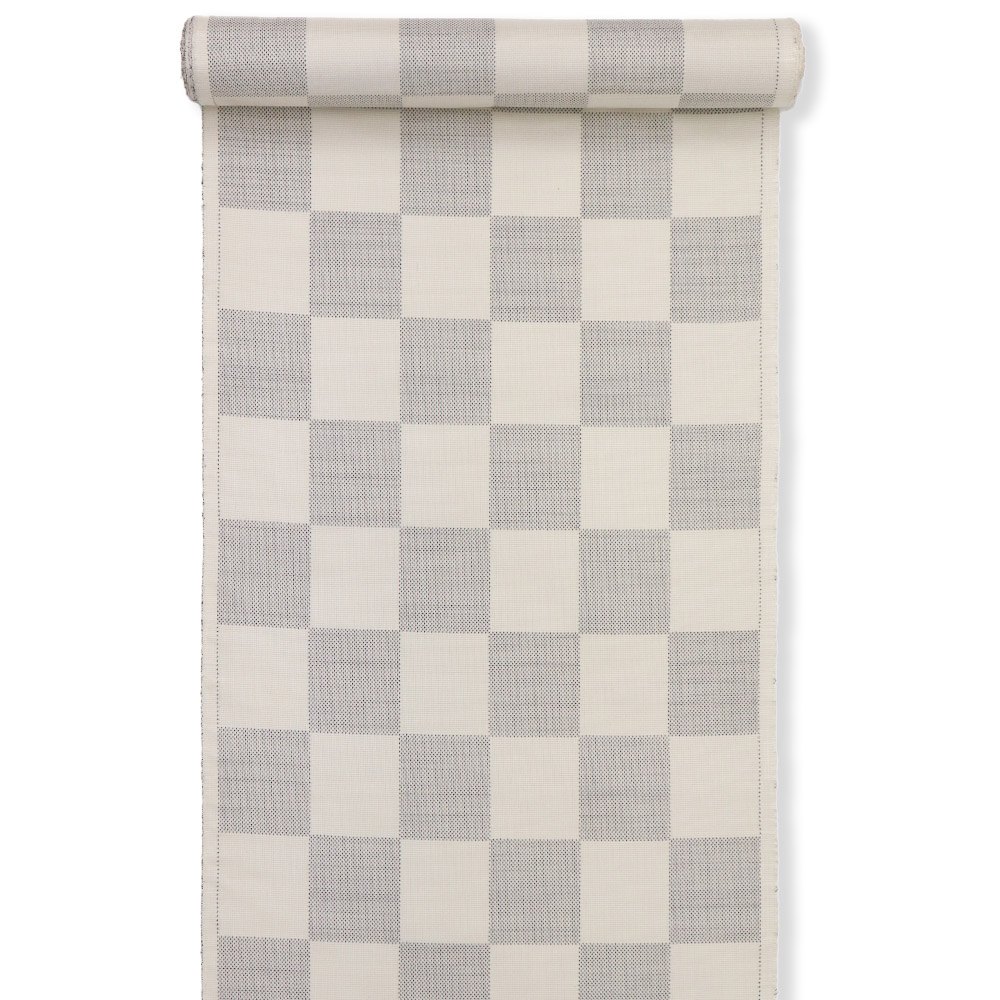 通常の大島紬と異なり、白の地に絣糸で模様を織り出した一本です。白地には薄黄色の糸が織り込まれており、ベージュ系の色合いが柔らかな印象に。年齢を問わずに着用できる市松模様で、長く使えるデザインになっています。