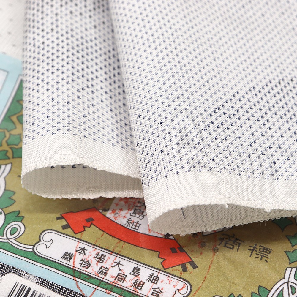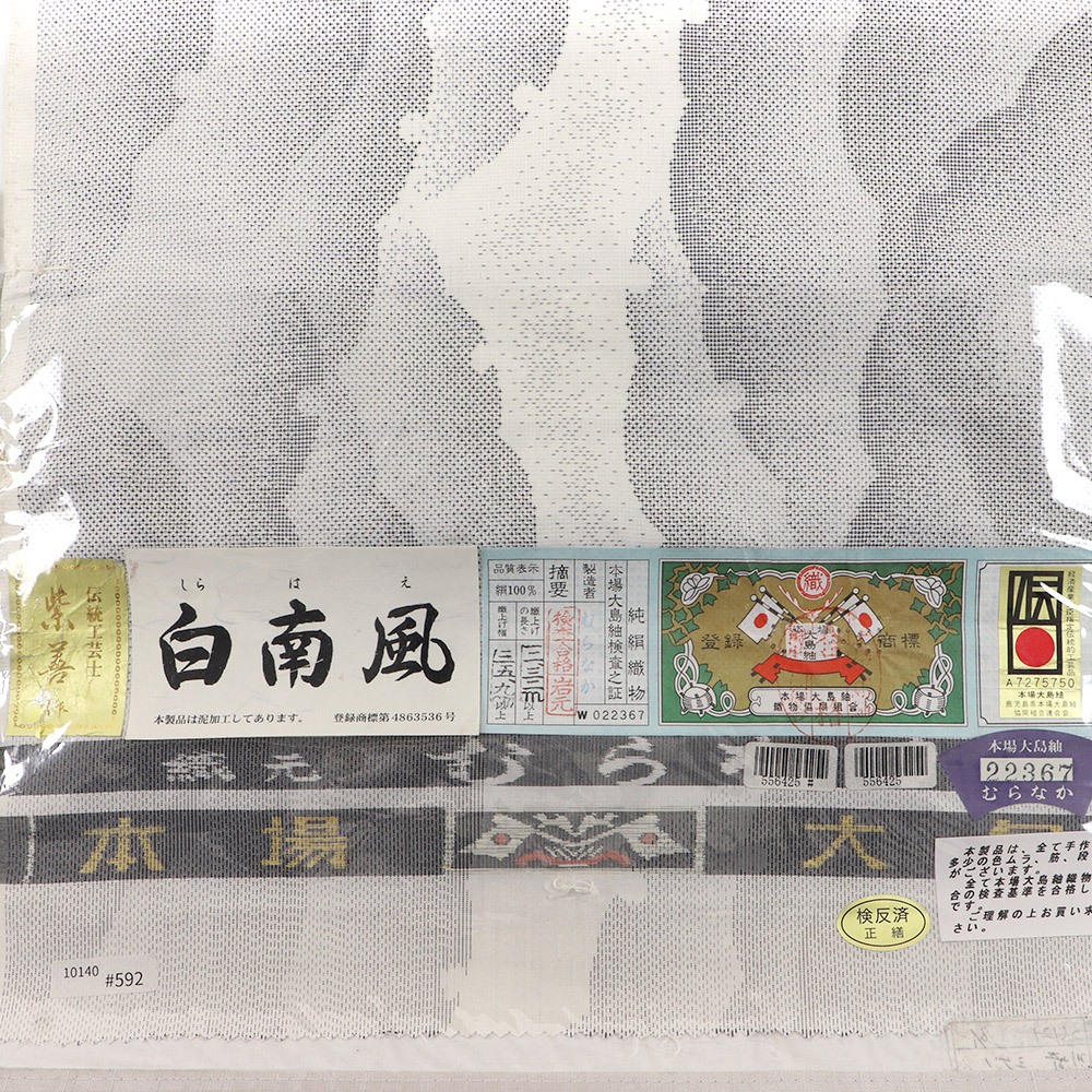 絣糸を使用した大島紬のみ貼られる水色証紙と、手織りであることを証明する伝統工芸マークが貼られた【むらなか】による白大島紬『白南風』。