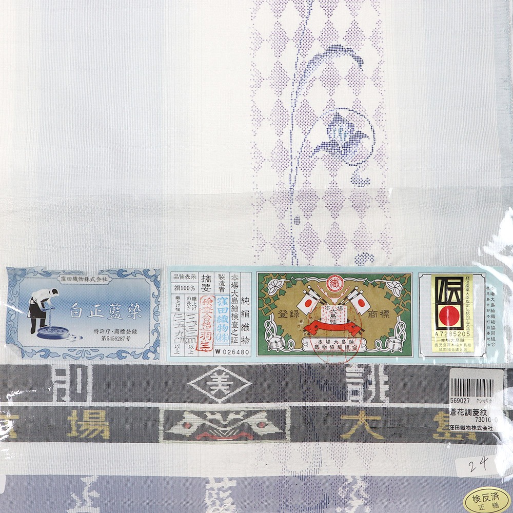 絣糸を使用した大島紬のみ貼られる水色証紙と、手織りであることを証明する伝統工芸マークが貼られた【窪田織物】による白正藍染め大島紬です。