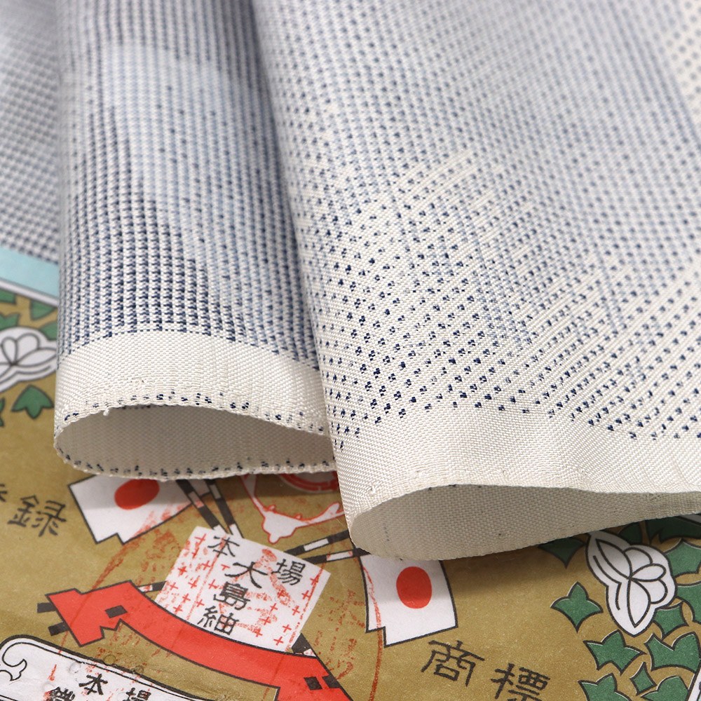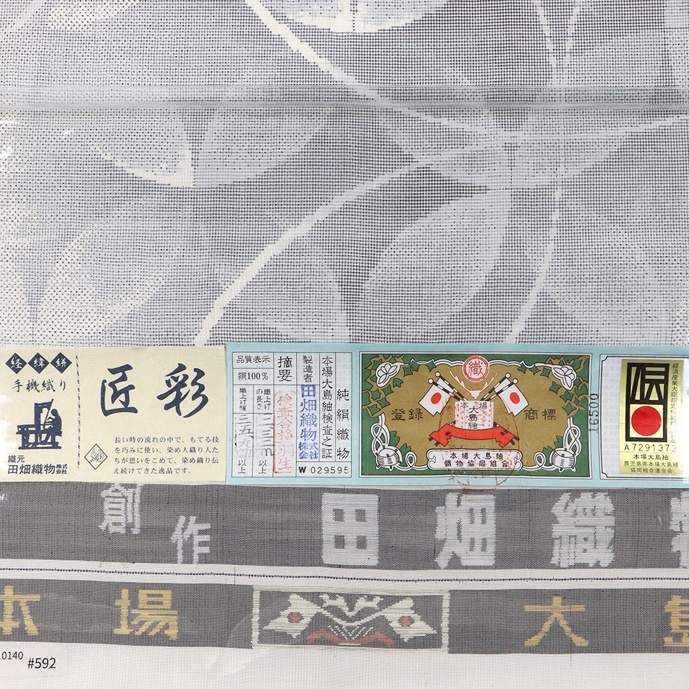 絣糸を使用した大島紬のみ貼られる水色証紙と、手織りであることを証明する伝統工芸マークが貼られた【田畑織物】による白大島紬。