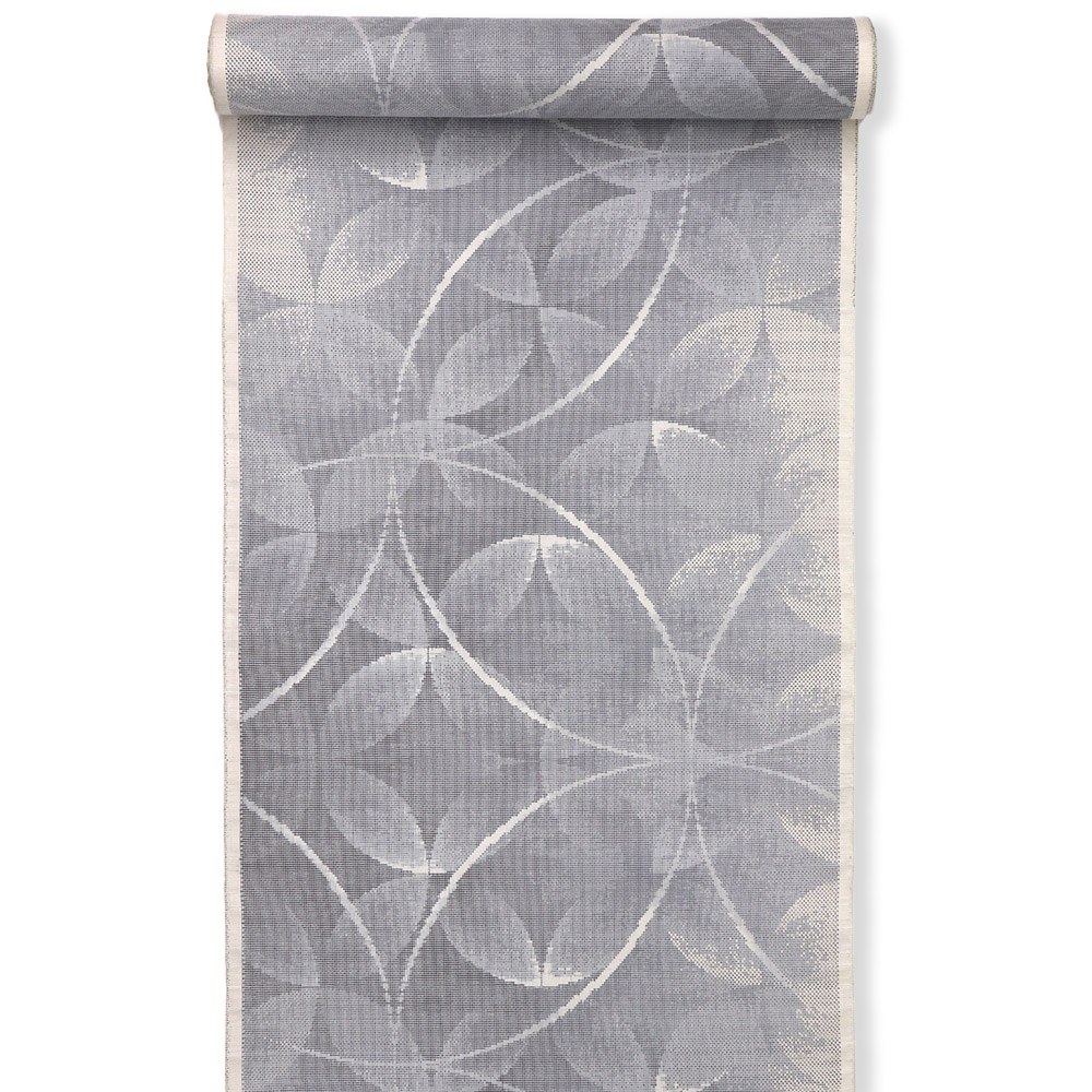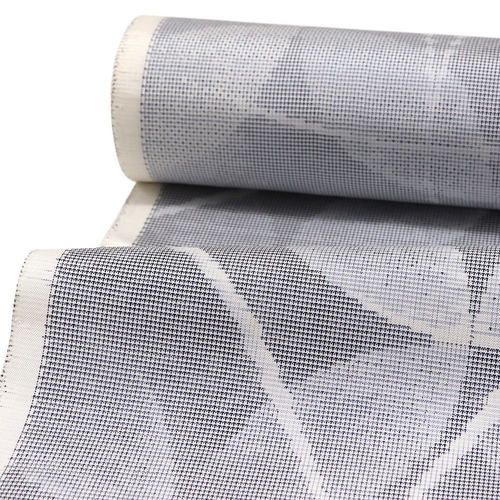 七宝重ねにぼかしを取り入れた繊細な柄行きが織り出されています。白と青を織り交ぜた色合いは、淡い色合いながら落ち着いた雰囲気に。大島紬の特徴である美しいシャリ感と光沢もあいまって、着姿に品と優雅さを与えてくれるでしょう。
