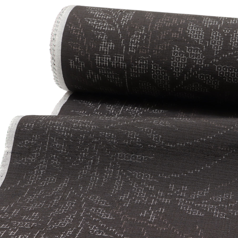 大変な手間と技術力を要する絣文様は、着尺の巾に配列できる亀甲の数(80山亀甲=80個)でその細かさを表しています。絣で象られた伸び伸びとした枝葉の文様は、まさに緻密で表情豊かな一枚になっています。