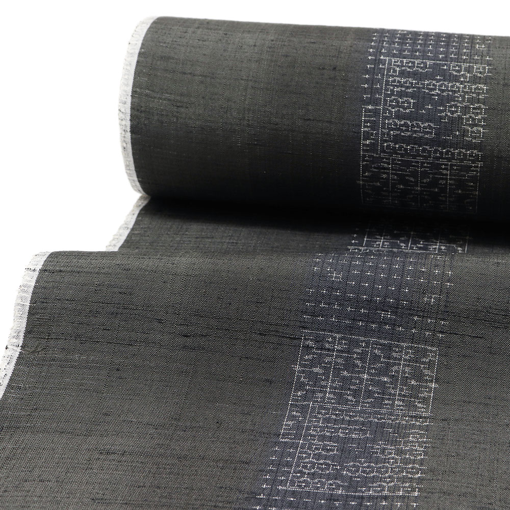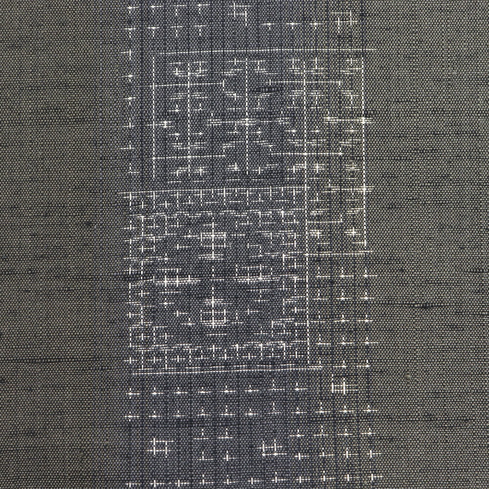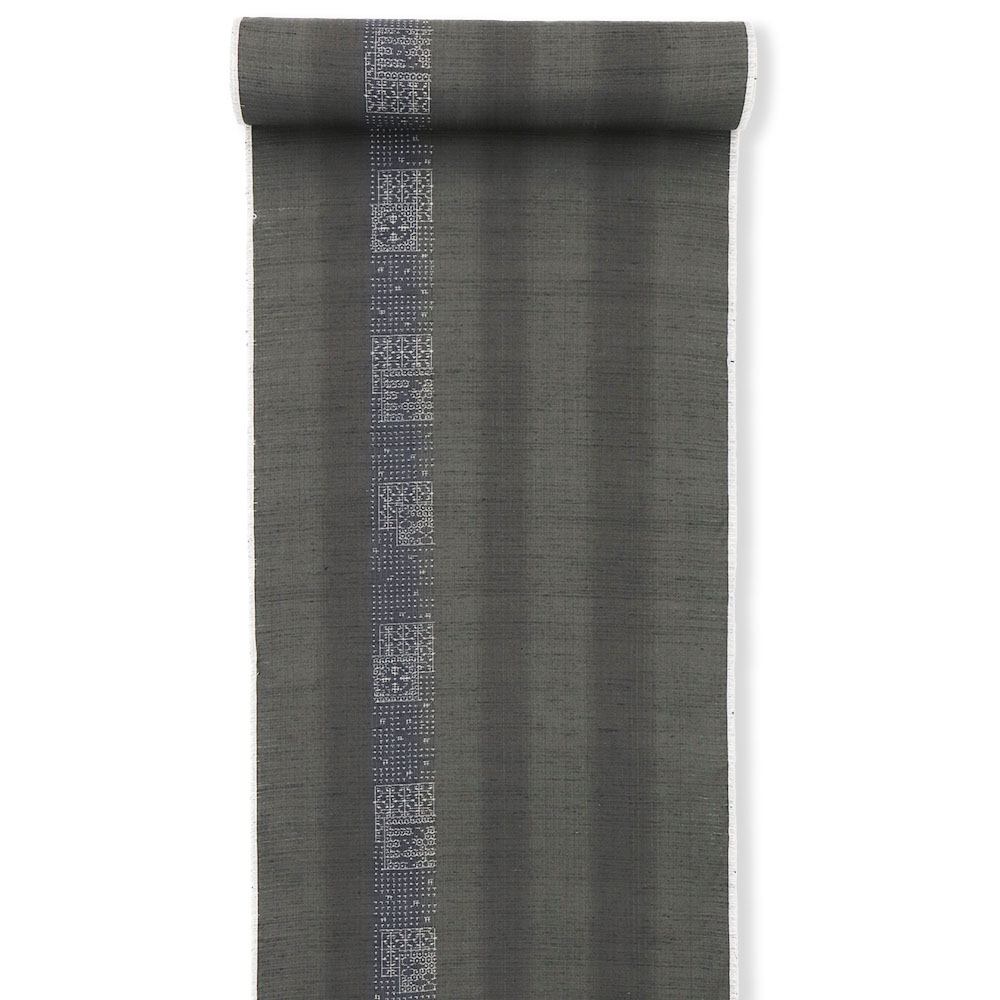 大変な手間と技術力を要する絣文様は、着尺の巾に配列できる亀甲の数(80山亀甲=80個)でその細かさを表しています。絣で象られた間道は、まさに緻密。縦に伸びる柄行きが民芸的な雰囲気に都会的なシャープさを演出します。