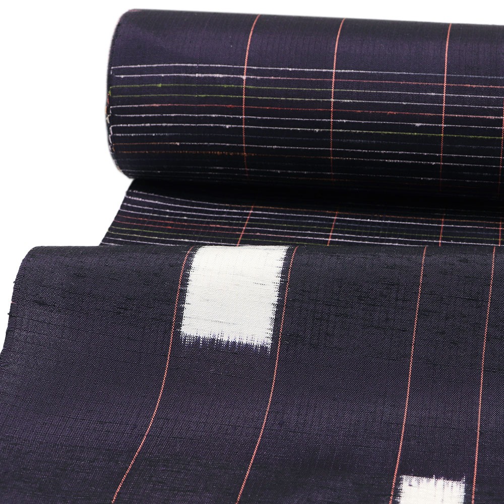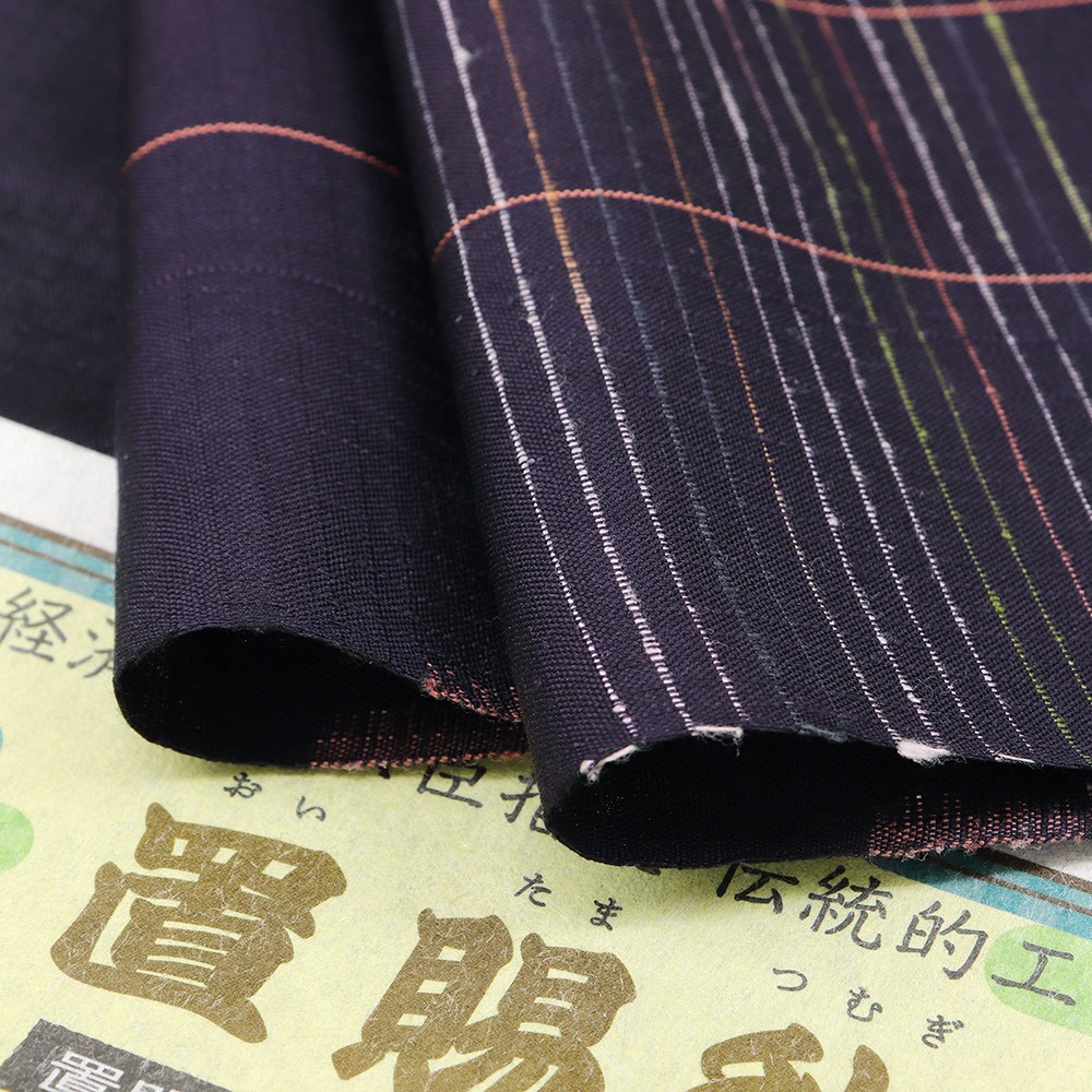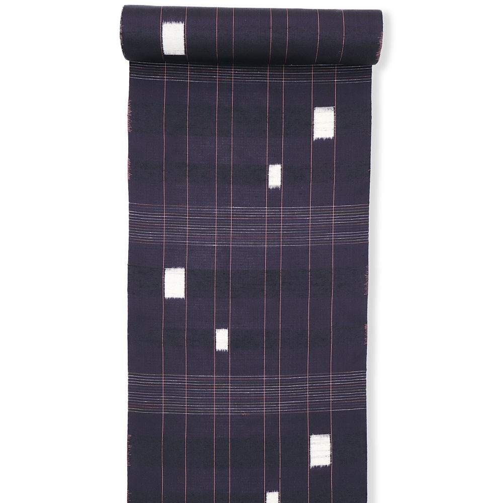 深みのある紫色に染められた糸で織られた紬は、風合いが豊かな逸品。オレンジの格子模様に、白く抜かれたような四角模様が、深みのある地色から浮かびあがるような鮮やかな発色を見せています。