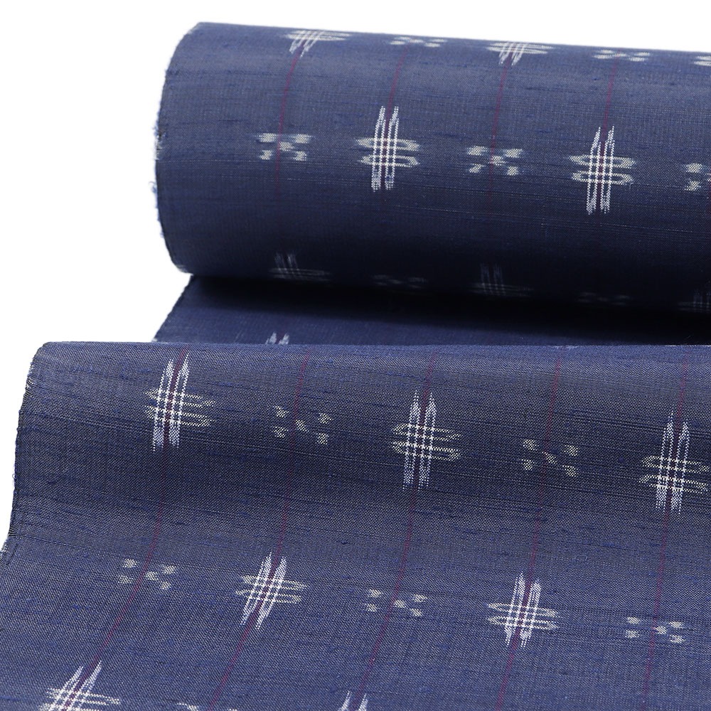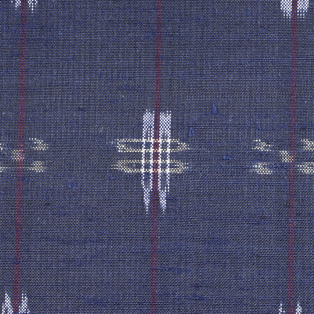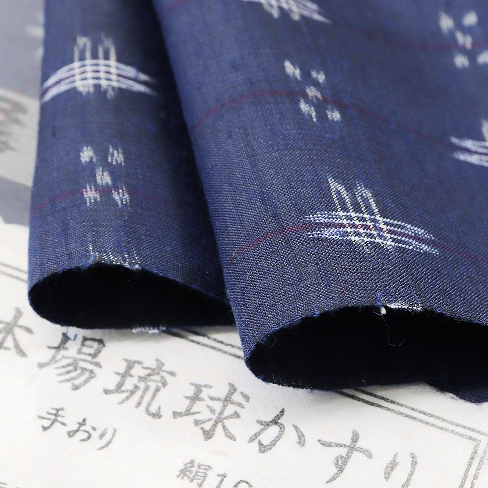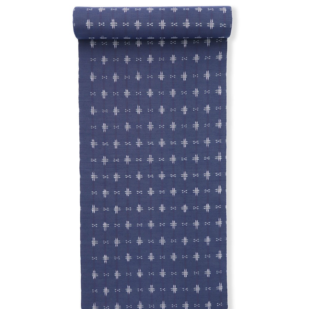 南風原村から生まれ、歴史の中で受け継がれた手仕事だけでなく激動の歴史の中で復興した力強さを感じられる琉球絣。彩り豊かな青地に、織り出された井桁絣がより深みをもたらし、紬特有の素朴さと民芸的な美しさを放ちます。