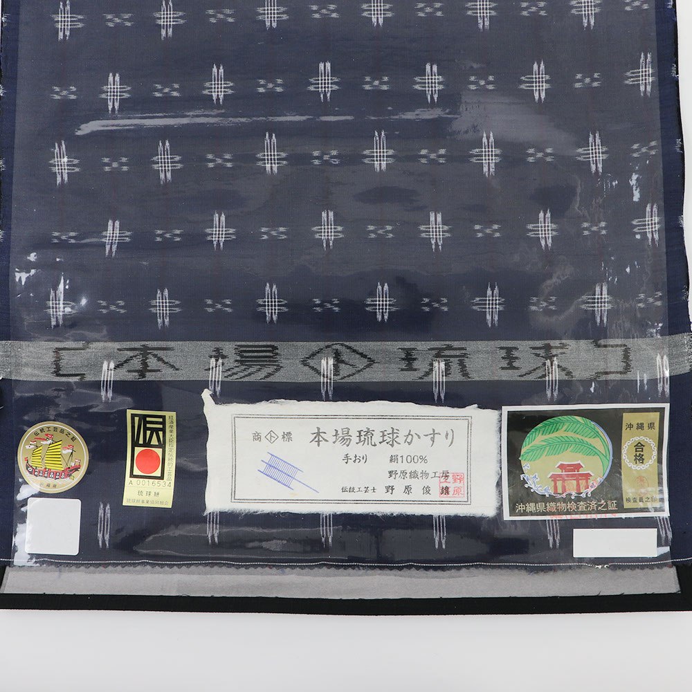 沖縄・南風原の工房【野原織物工房】謹製の琉球絣。経産相の伝統工芸マークや沖縄県の伝統工芸マークが貼られた逸品です。