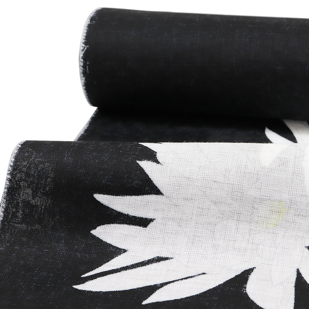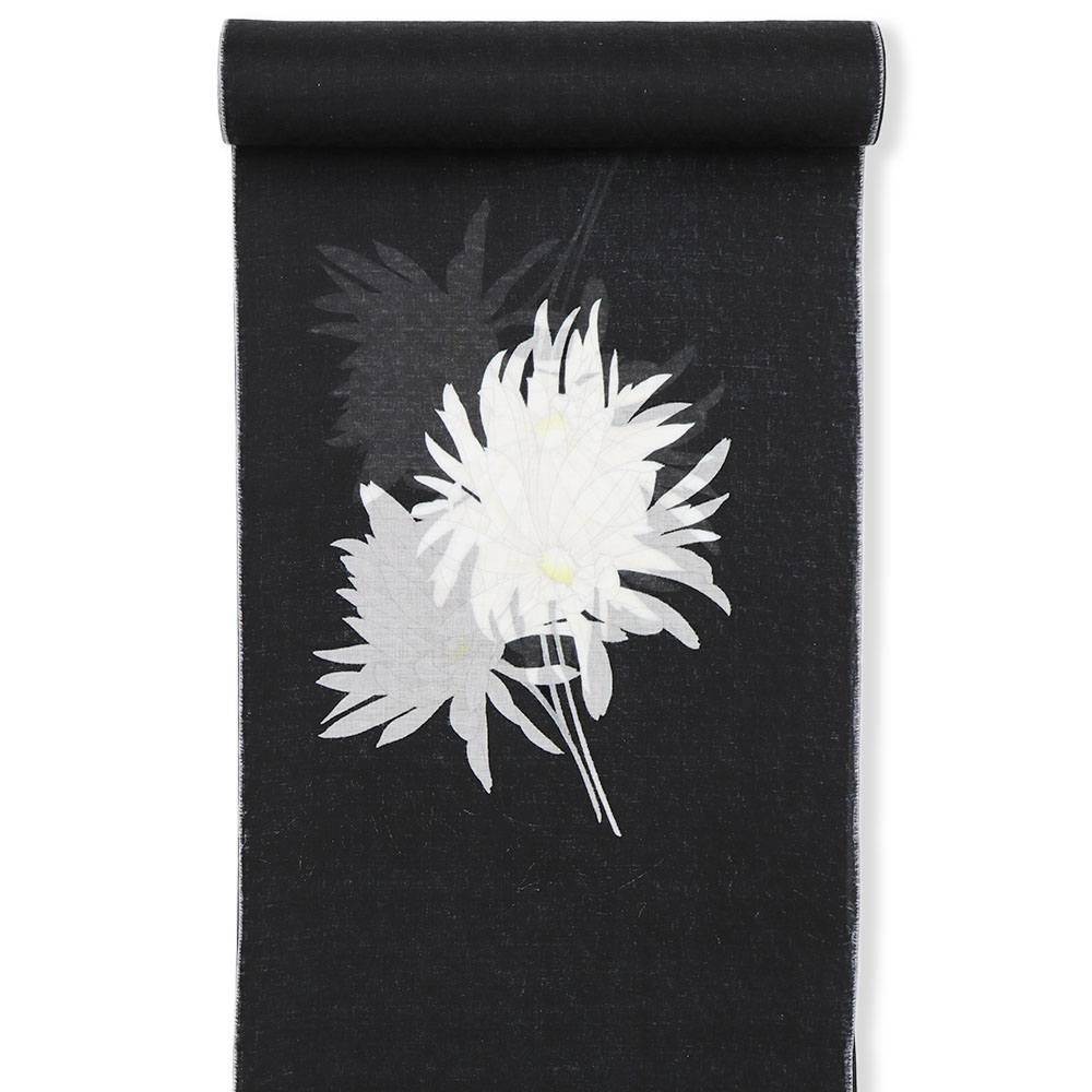 黒に映える華模様が特徴的な「月照乱華」。透き通るような白い華が重なり合い、モダンな雰囲気ながら、ミステリアスで幻想的な着姿を演出します。