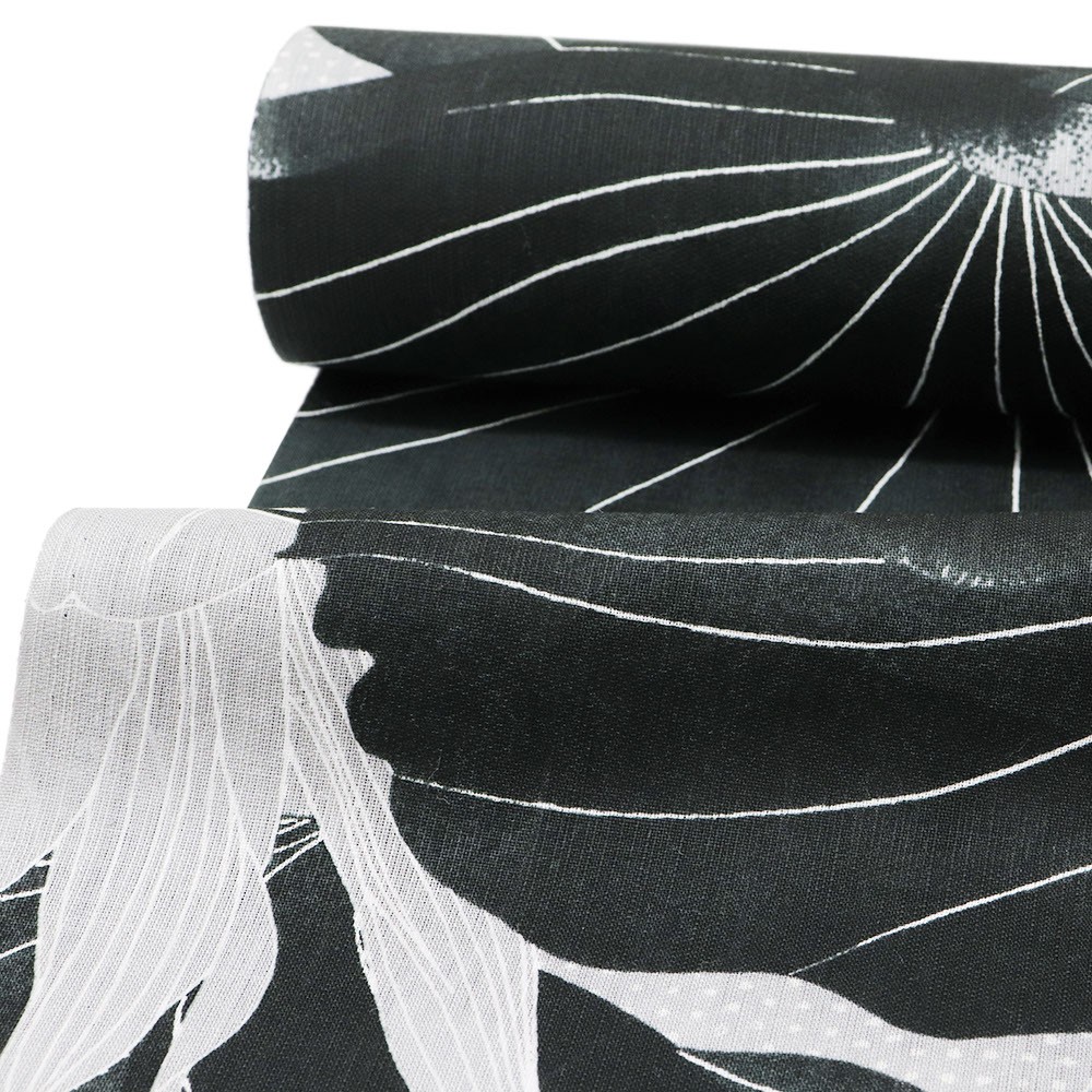 「蓮華抄」と名付けられたこちらは、白と黒で蓮華の葉を表現した一枚です。モノクロベースの柄行きに、繊細な描線が映えるシャープなデザインに。型に嵌らない唯一無二な夏の着姿を演出してくれます。