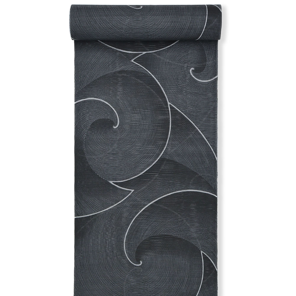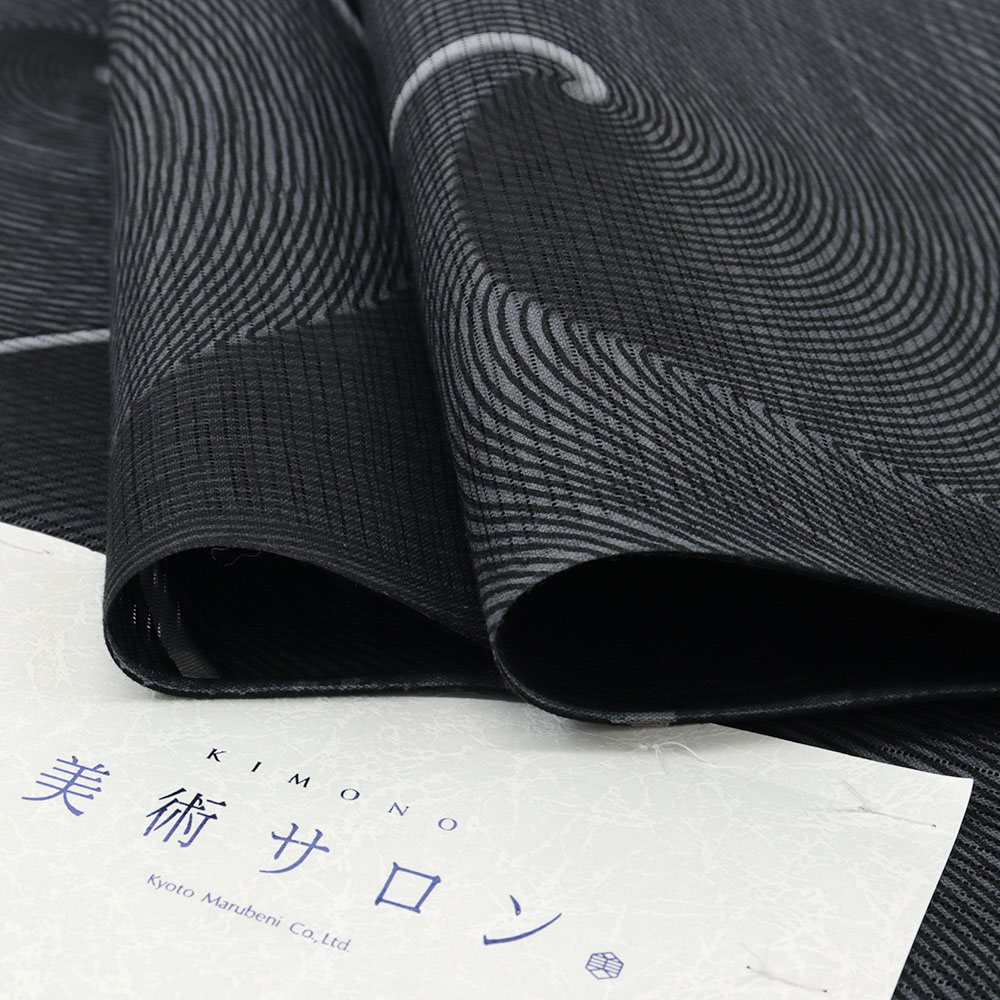 細密な型を用いて染められた、精緻な渦文はシャープな印象で、凛とした着姿を実現してくれそう。長襦袢や足袋を合わせて夏着物にしたり、気軽な半巾帯を締めて浴衣にしたり、表現したいスタイルに合わせてコーディネートをお楽しみいただけます。