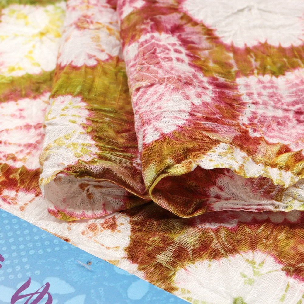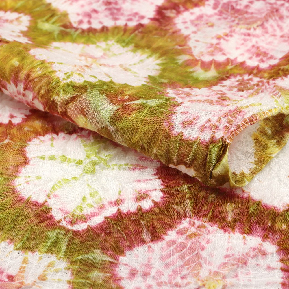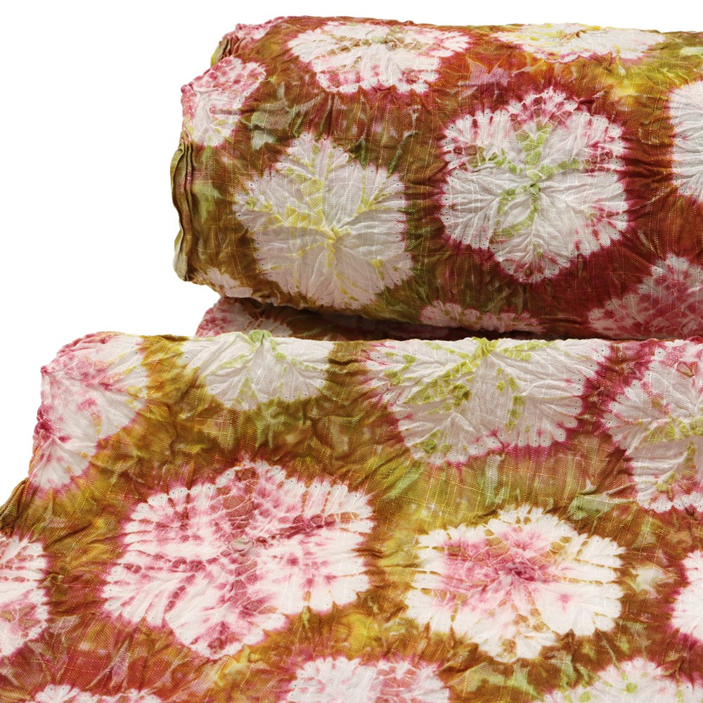 桃×鶯色が重なる地に浮かぶ絞り模様が、可愛らしくもオトナな仕上がりに。ふんわり柔らかでいてサラっと感も残る綿麻の風合いから、爽やかな着心地を体感いただけることでしょう。