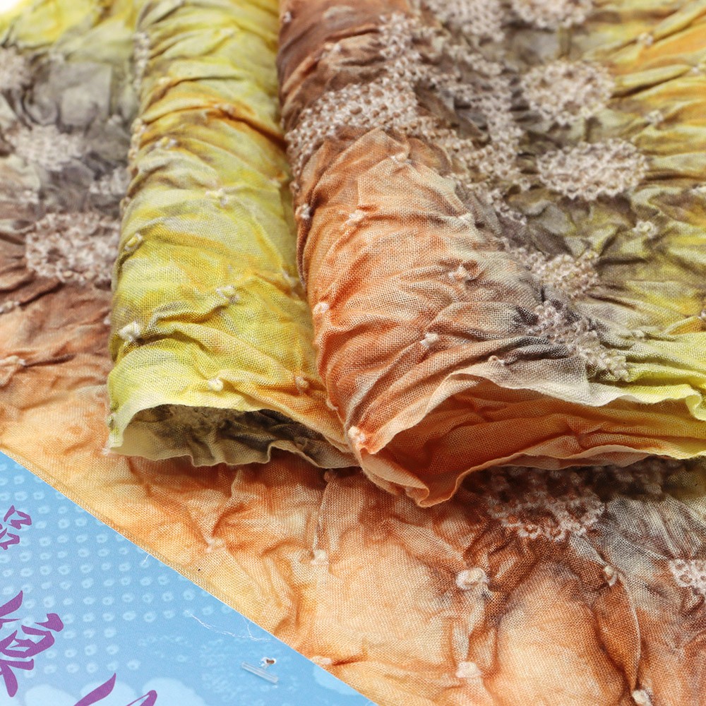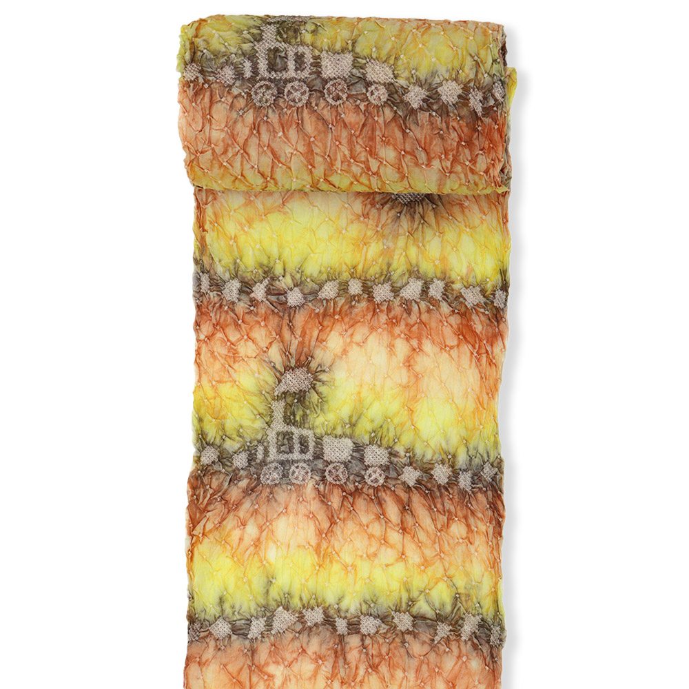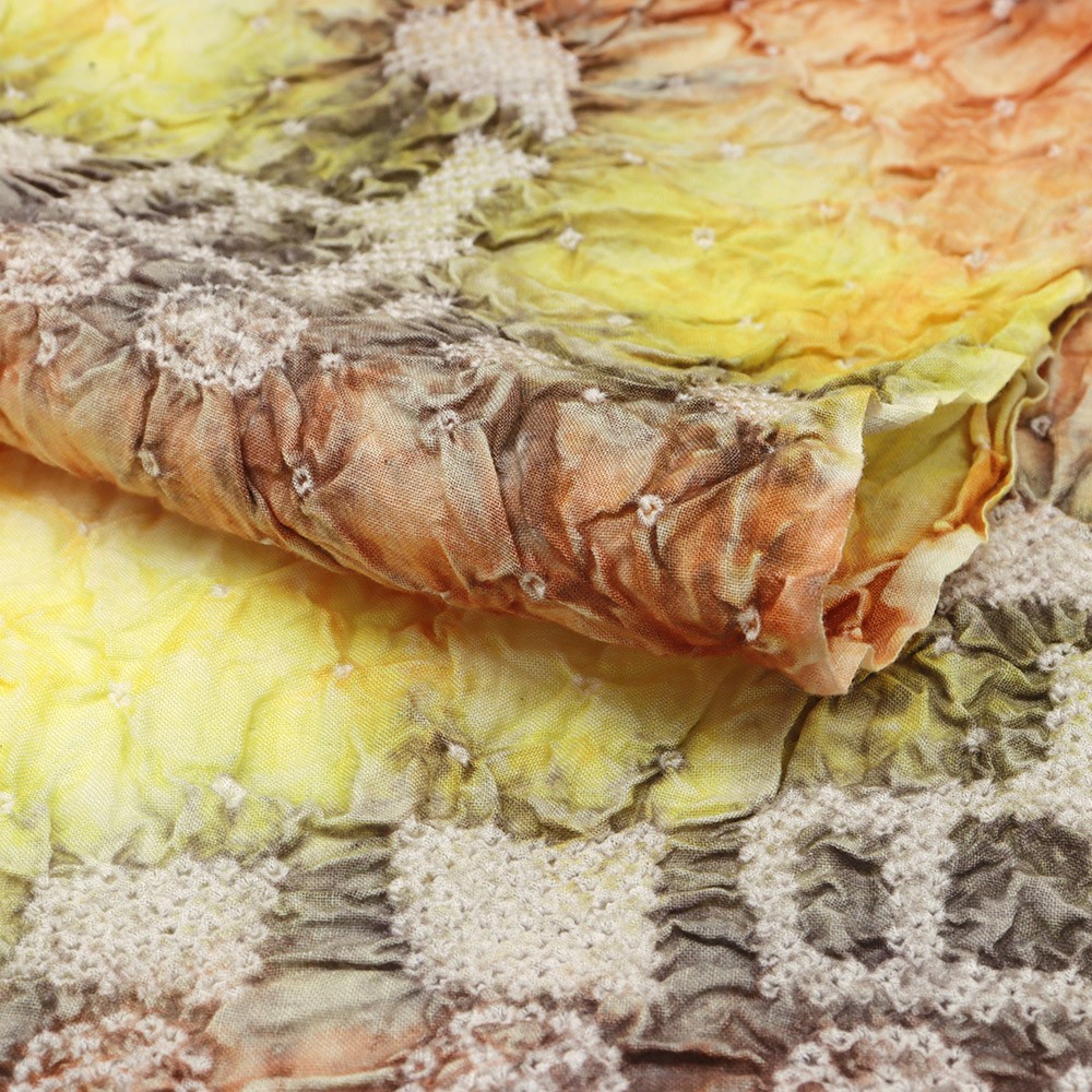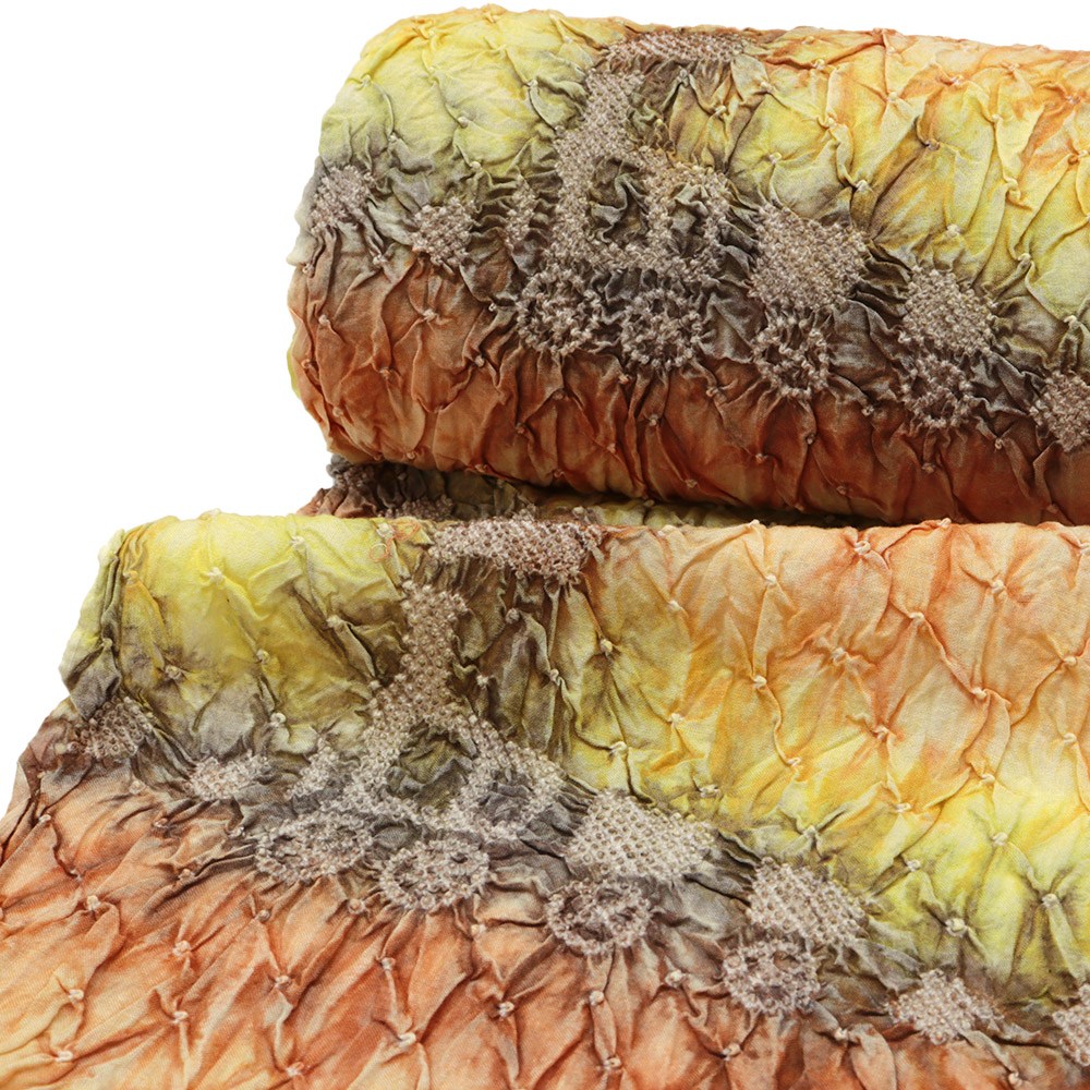 黄×橙色のぼかし地に広がる絞り模様が、個性的な仕上がりに。軽やかかつ、ふんわり柔らかな綿の風合いから、包まれるような着心地を体感いただけることでしょう。