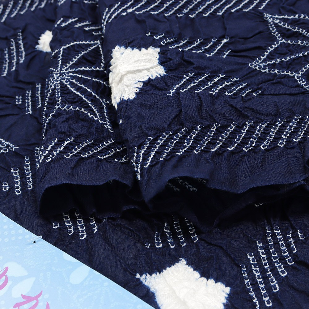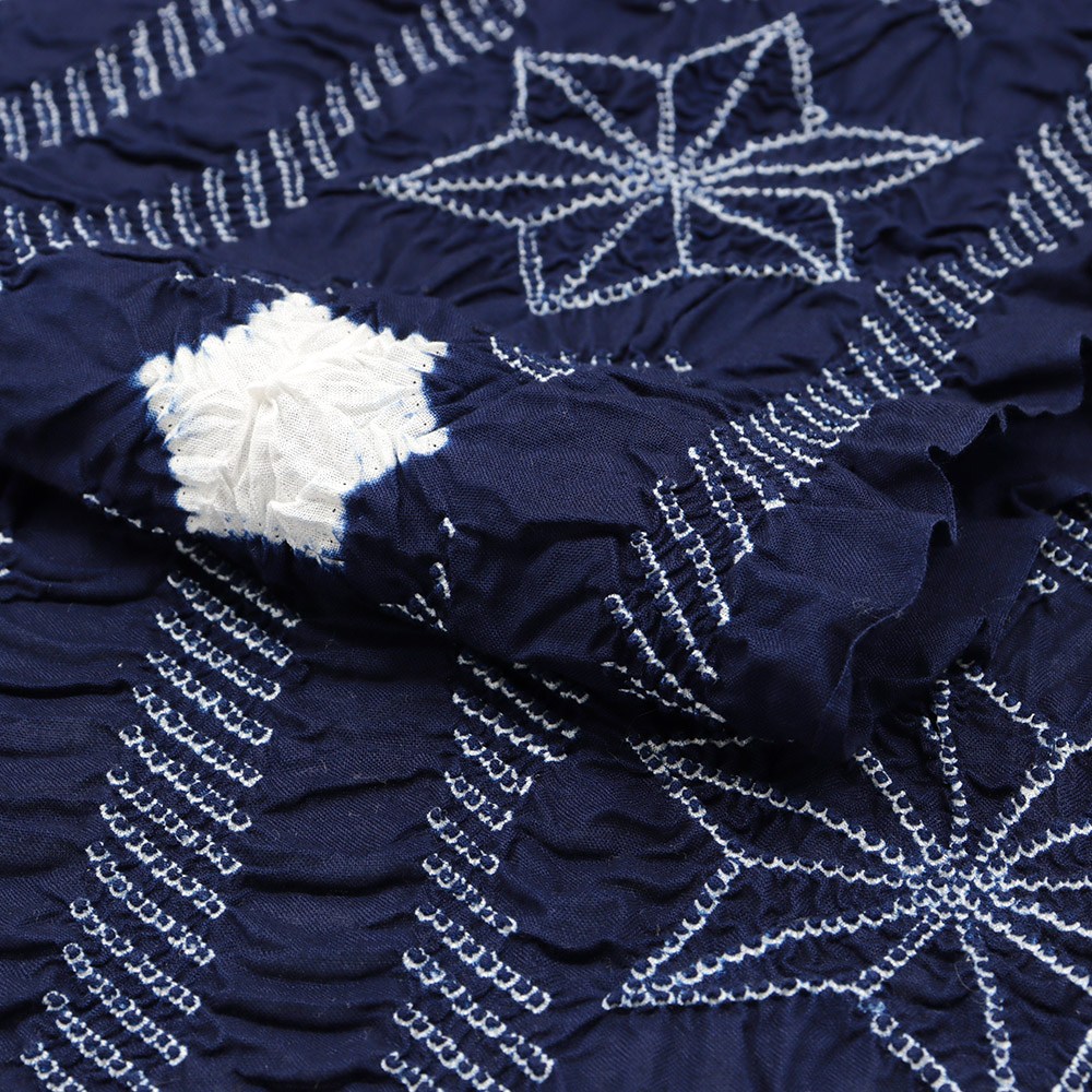 紺地に広がる絞り模様が、しっとりオトナな仕上がりに。軽やかかつ、ふんわり柔らかな綿の風合いから、包まれるような着心地を体感いただけることでしょう。