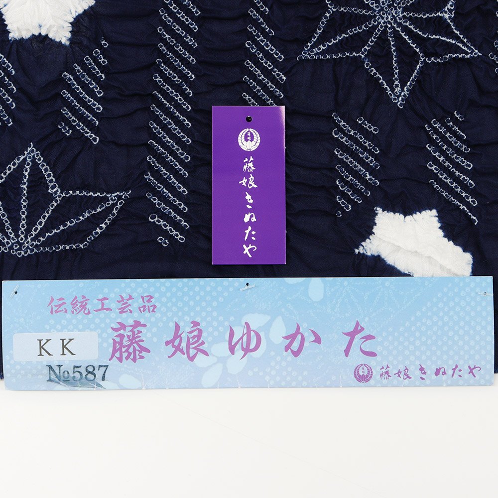 1947年に創業、精巧な絞りの技と雅趣に富んだ色彩が特徴的な【藤娘きぬたや】による総絞り浴衣。