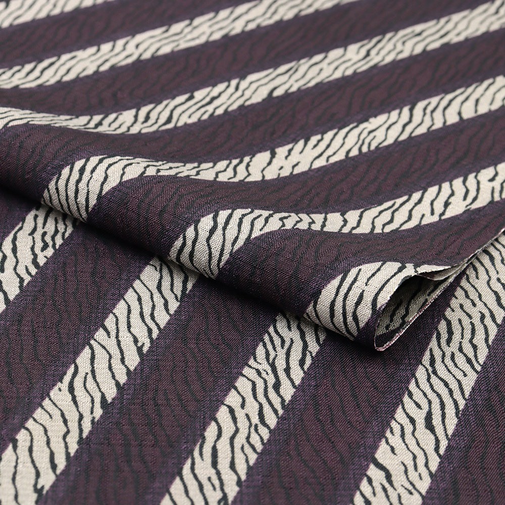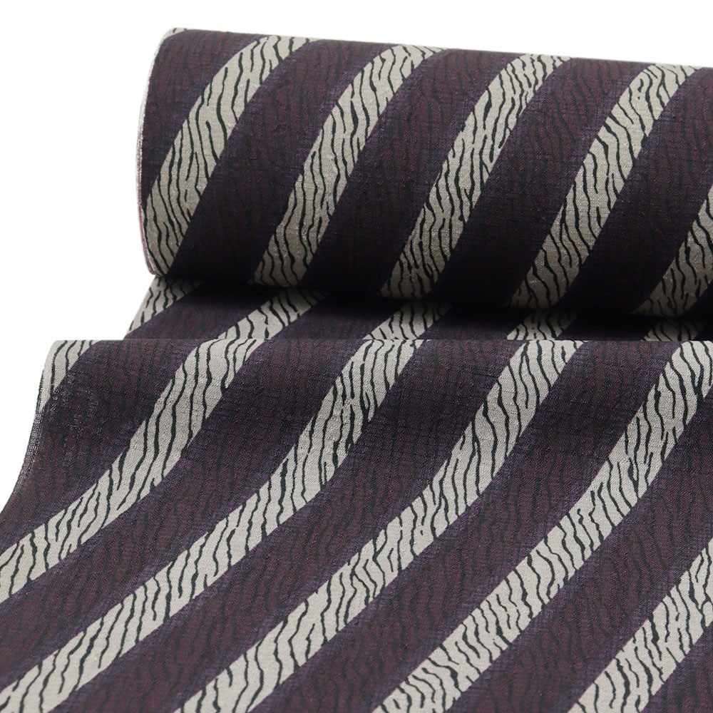 紅梅織りのような格子の織り目が味わい深い生地に、斜め縞とゼブラ模様が広がるモダンな一枚です。半巾帯を合わせてカジュアルに、名古屋帯を合わせればきちんと感を醸し出す夏着物に。現代の街並みに溶け込むワンピースのようなモダンさで、気軽に楽しんでいただきたい着物です。