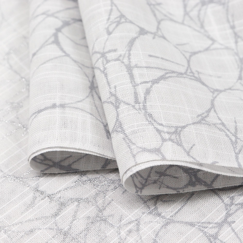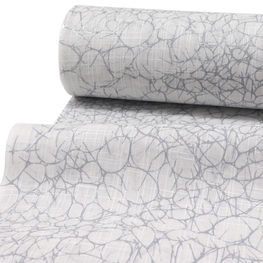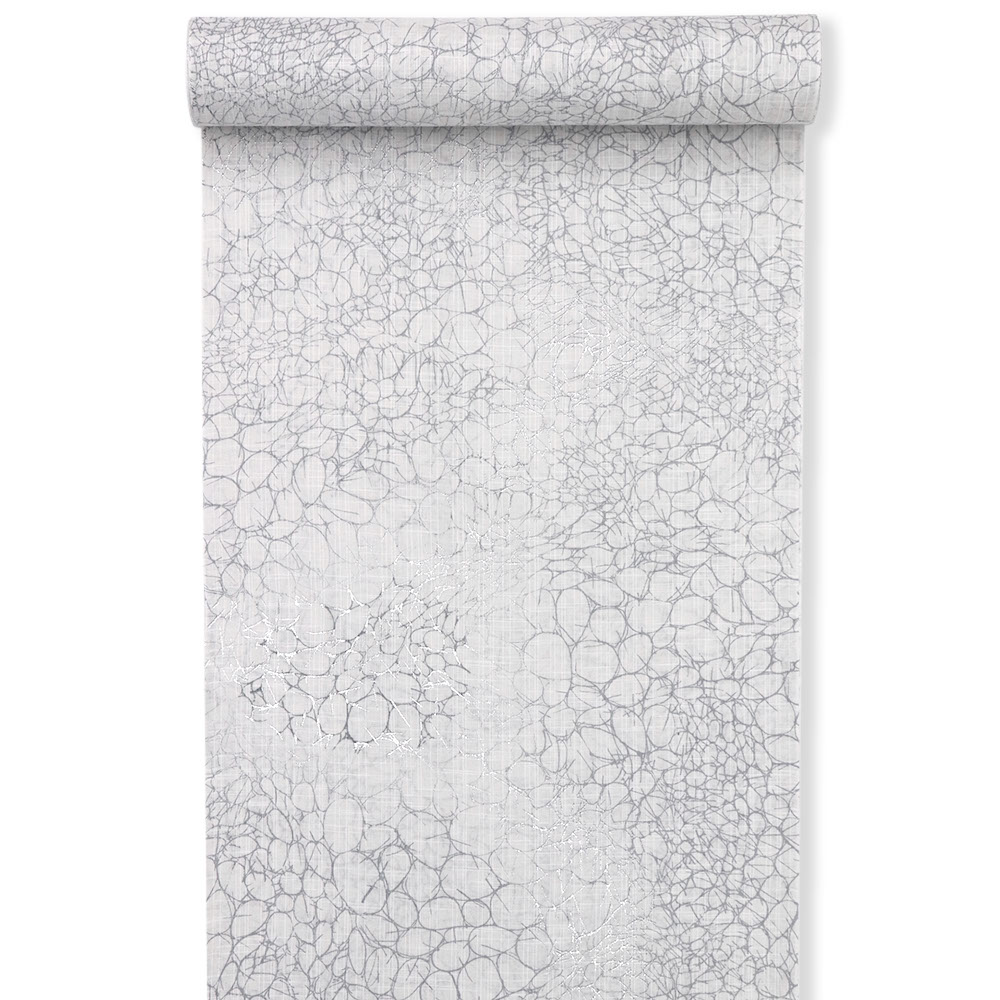 白の地色に銀彩で鎖帷子模様を配した一枚。抽象的でモダンなデザインが、型に嵌らない唯一無二な夏の着姿を演出してくれます。