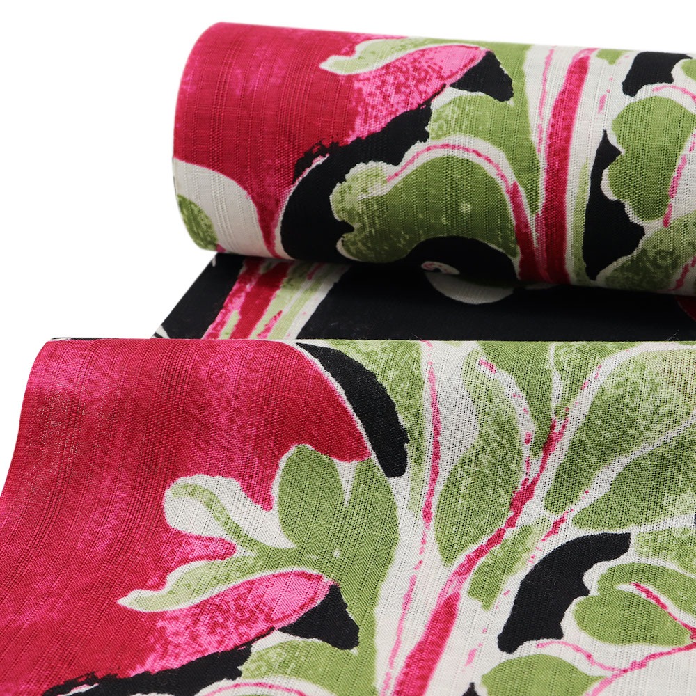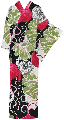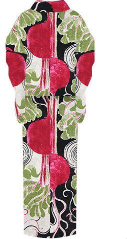「女神デメテル」と名付けられたこちらは、豊かな色彩とうねるようなデザインが特徴的な一本。絵の具で描いたようなかすれやにじみが一枚の浴衣にさまざまな表情を与えてくれます。