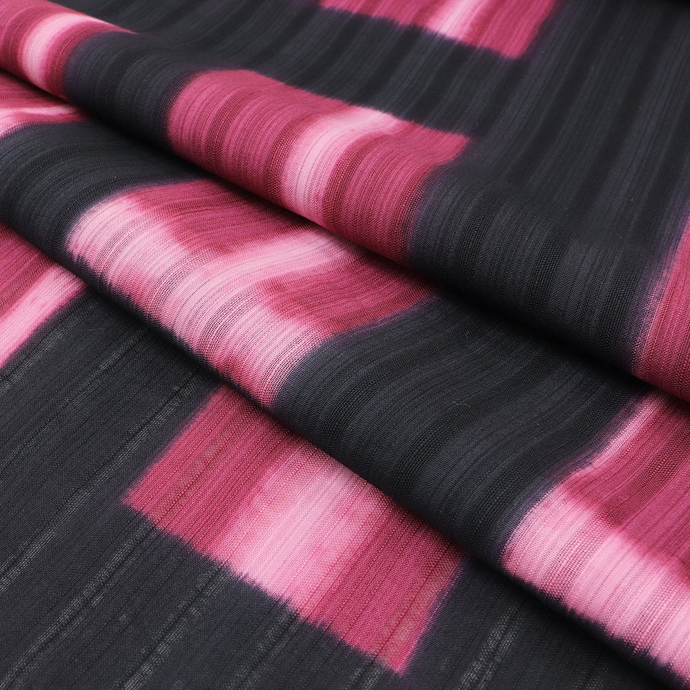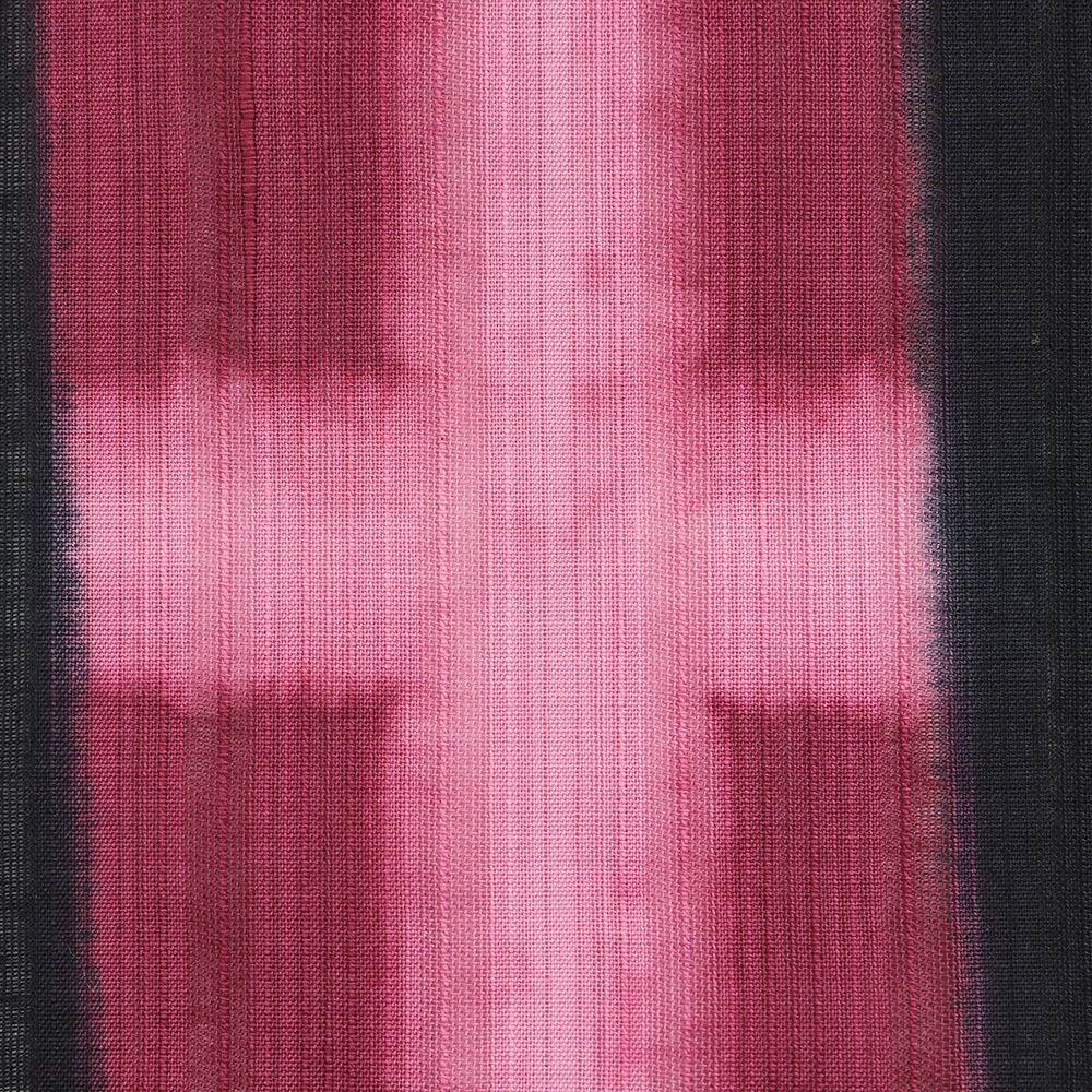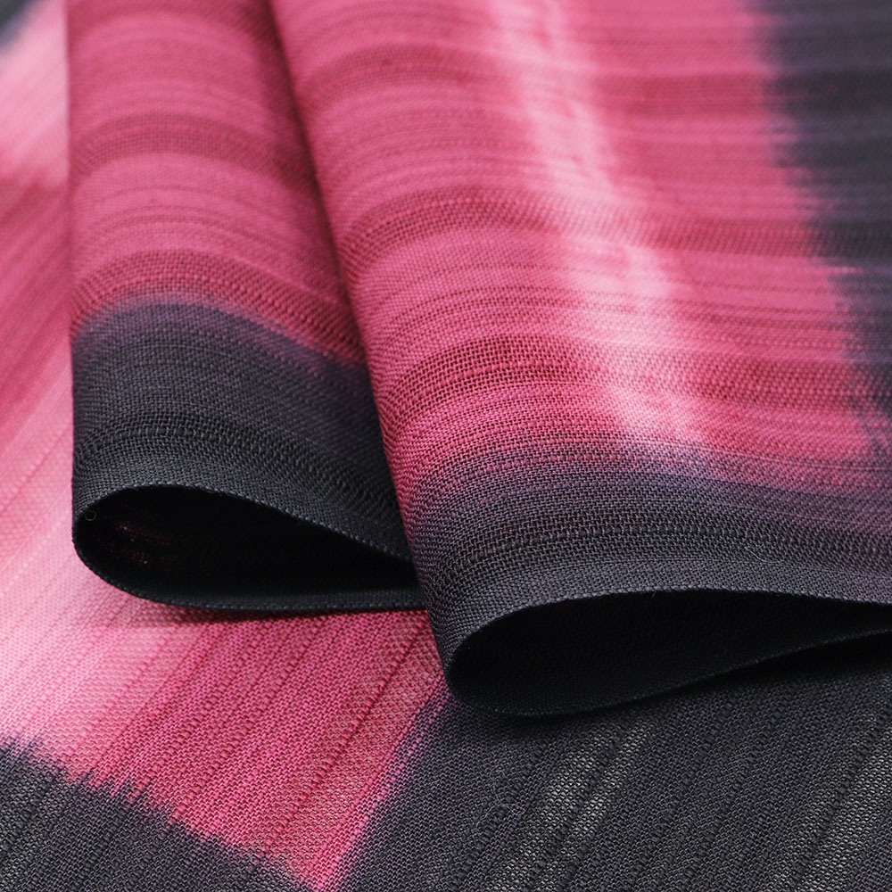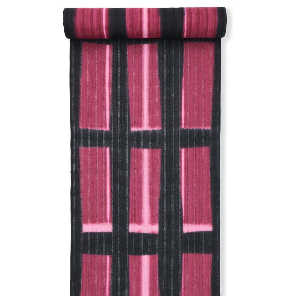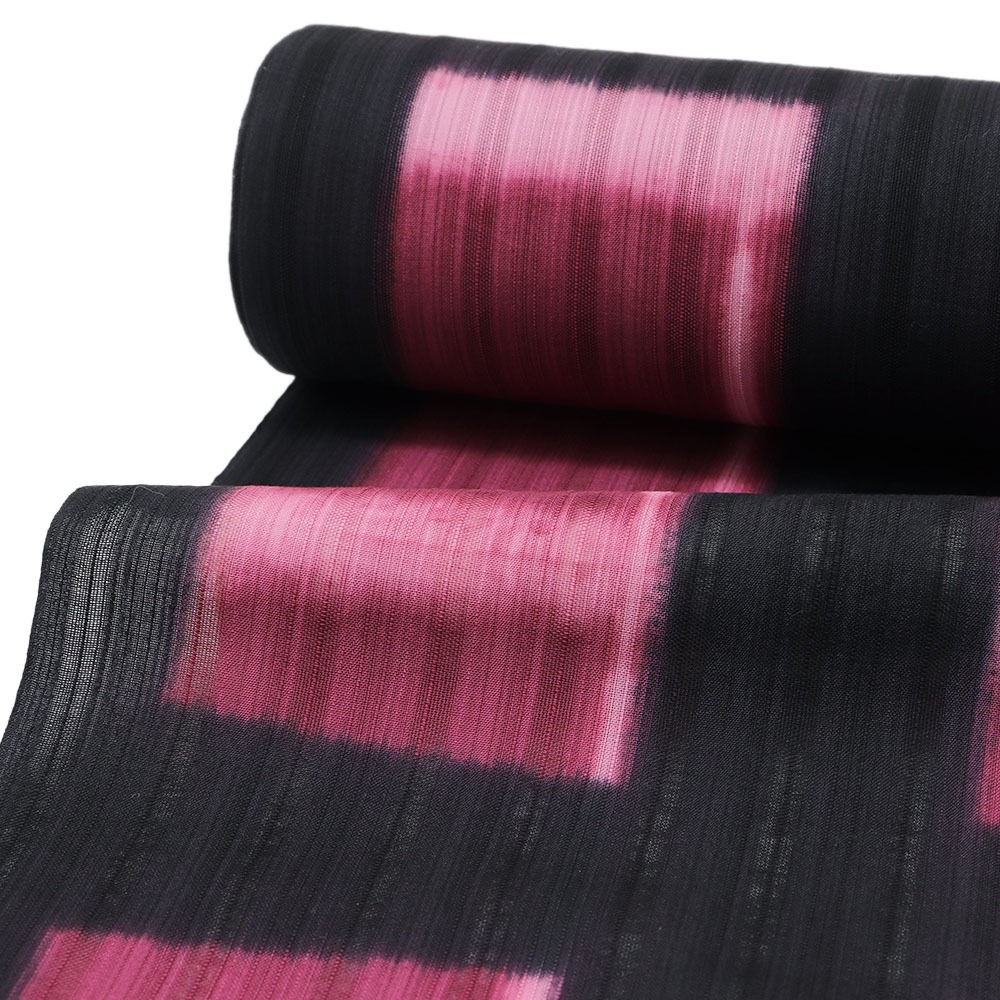 変わり織が涼しげな綿地に、黒色×赤紫色で板締め絞りを施した一枚。コントラストが強い配色ながら、濃淡にゆらぎのある染め柄が柔らかな雰囲気も備えます。