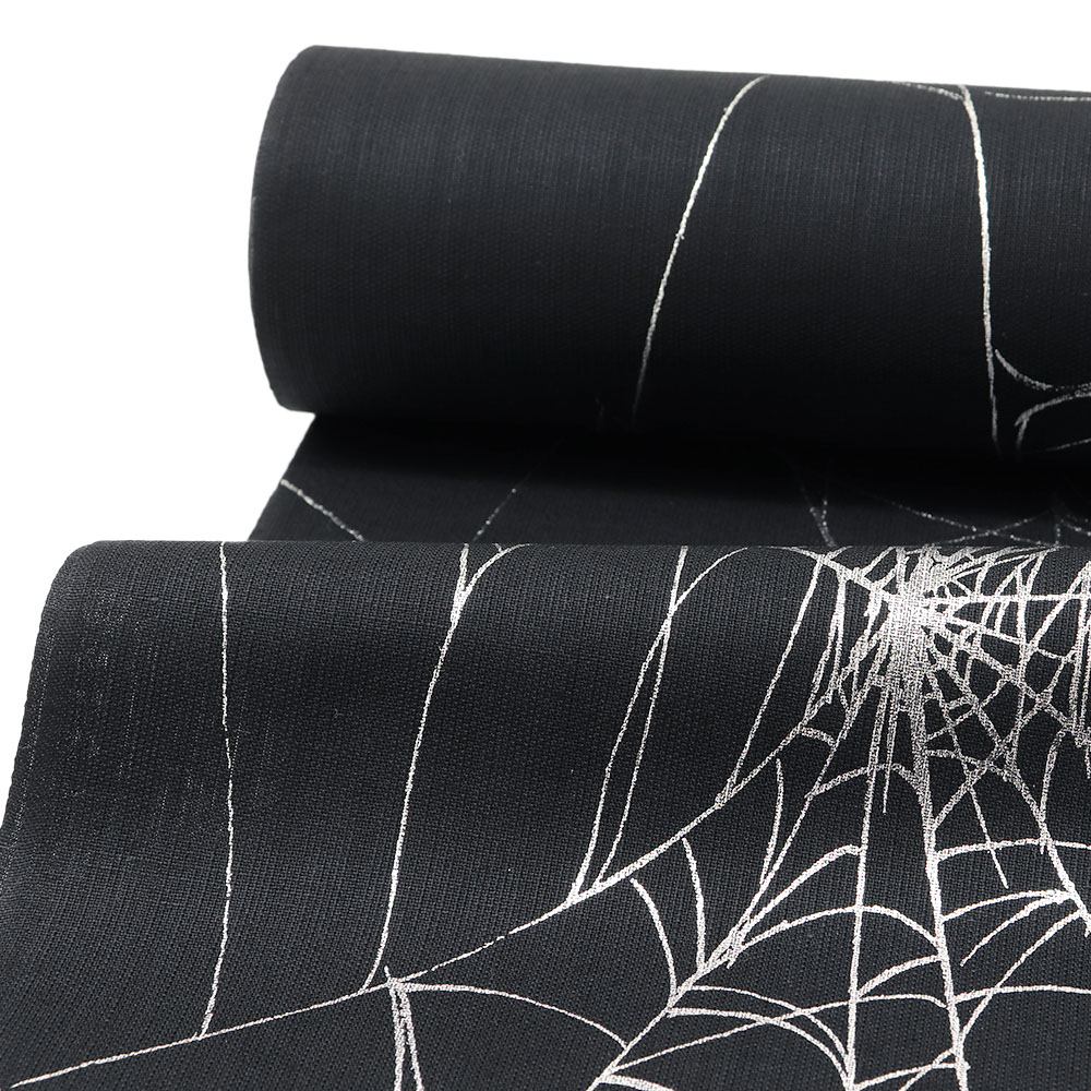 黒の地に銀彩でくもの糸を描いたデザイン。同系色の帯でシンプルに、アクセントカラーや差し色でさらにオシャレに、小物使いで遊んでみたり。あなたのセンスでとっておきの浴衣コーデを組んでみてはいかがでしょうか。