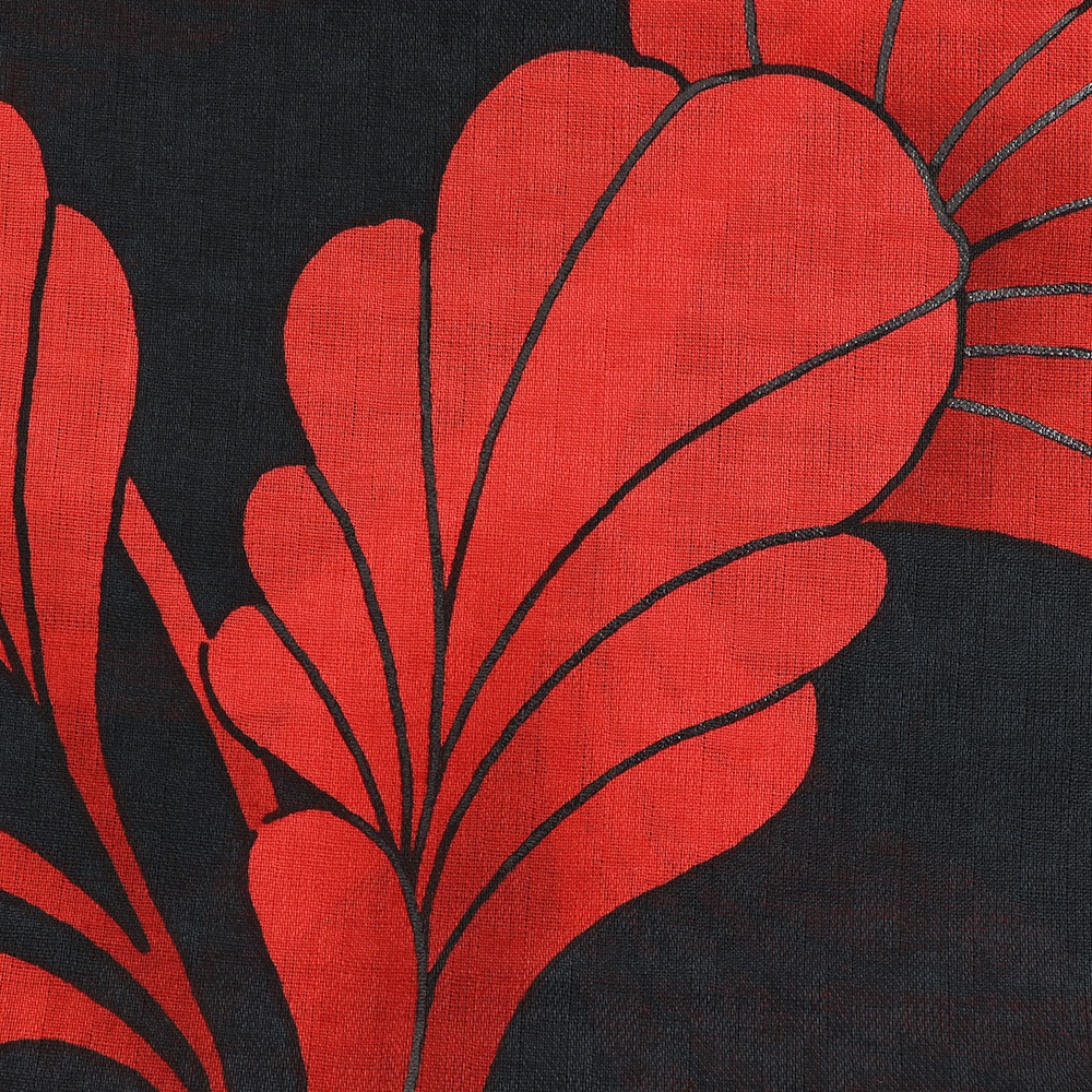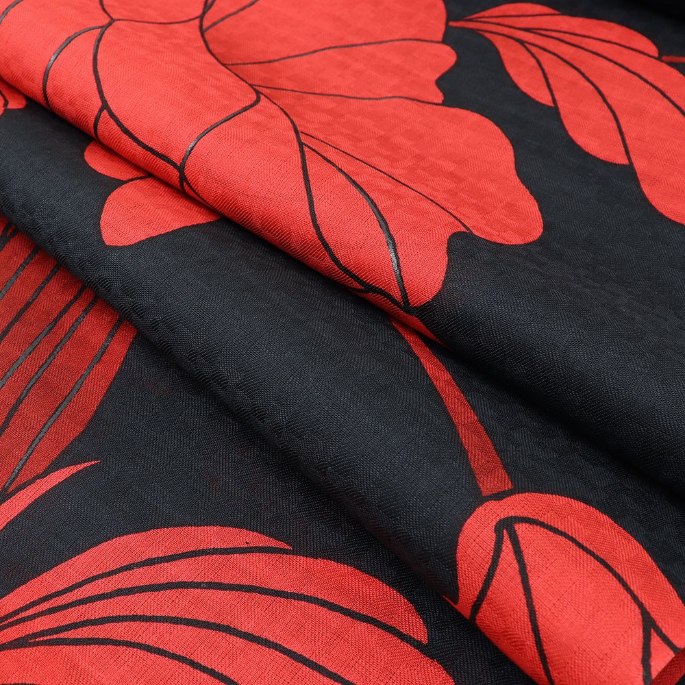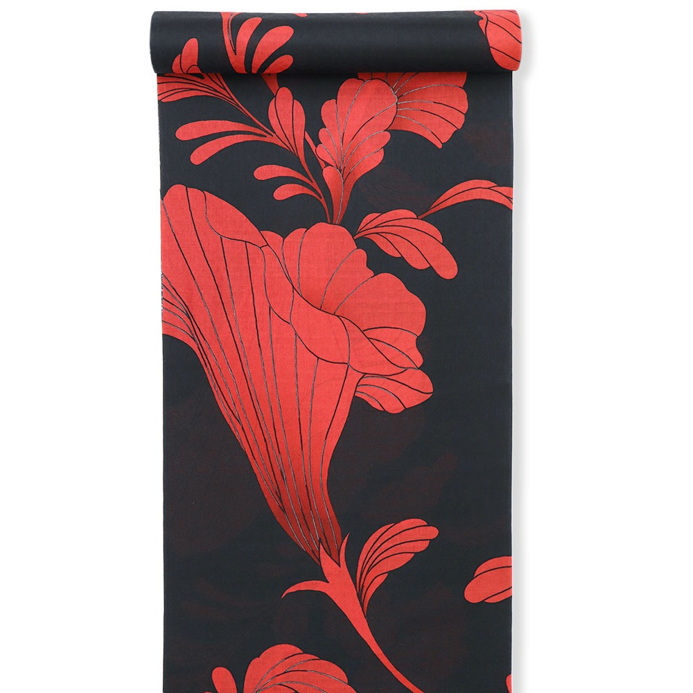 ユリやカラーを思わせる流線形のデザインが美しい一枚。大胆な構図と色合いが、夏の着姿に印象的なコントラストを与えてくれます。色数を抑えてシンプルに、差し色を足してもっと個性的に…とコーディネートを考える時間も楽しくなりますね。
