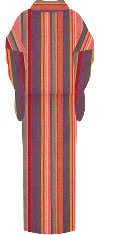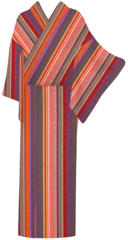 定番の縞模様は、赤や橙色を基調に、紫や灰をアクセントにすることで現代的な柄行に。きちんと感には名古屋帯を、ラフに着こなす普段着物には半幅帯を締めるなど、多彩なコーディネートが楽しめます。ぜひ洋服を選ぶように、気楽に楽しんでほしい一枚です。