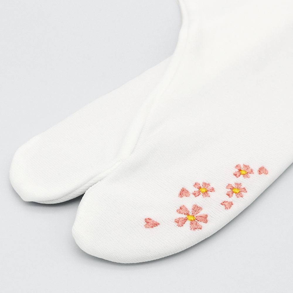 小さなピンクの桜柄刺繍が、足元に可憐なアクセントをプラス。指先ワンポイントなのでコーディネートの邪魔をせず、上品なオシャレを演出できます。