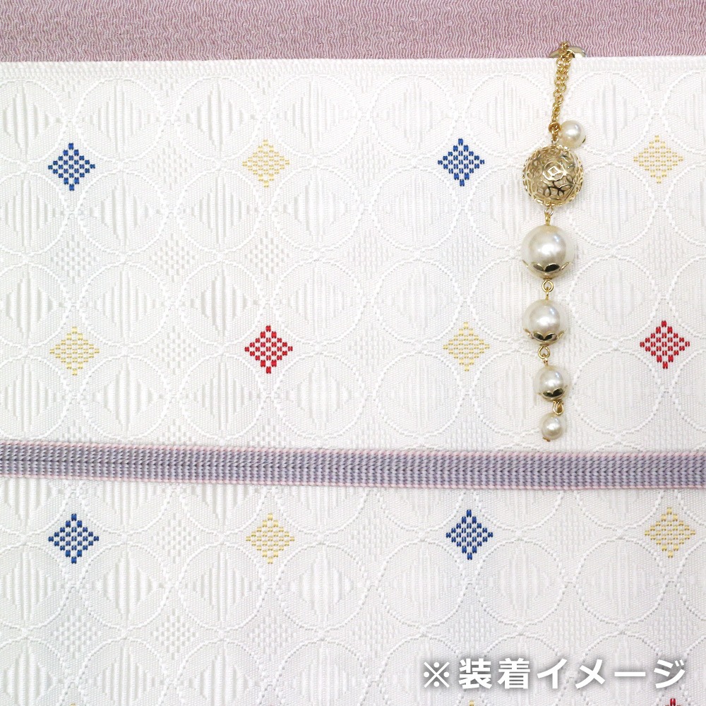 金色で作られた宝柄の透かし玉を中心に、大小のパールを重ねて高級感が漂うしっとりとした印象に。帯にそっと挿せば動くたびにゆらゆらとキラキラと輝きます。小粋なアクセントとしてオシャレ使いにコーディネートをお楽しみください。