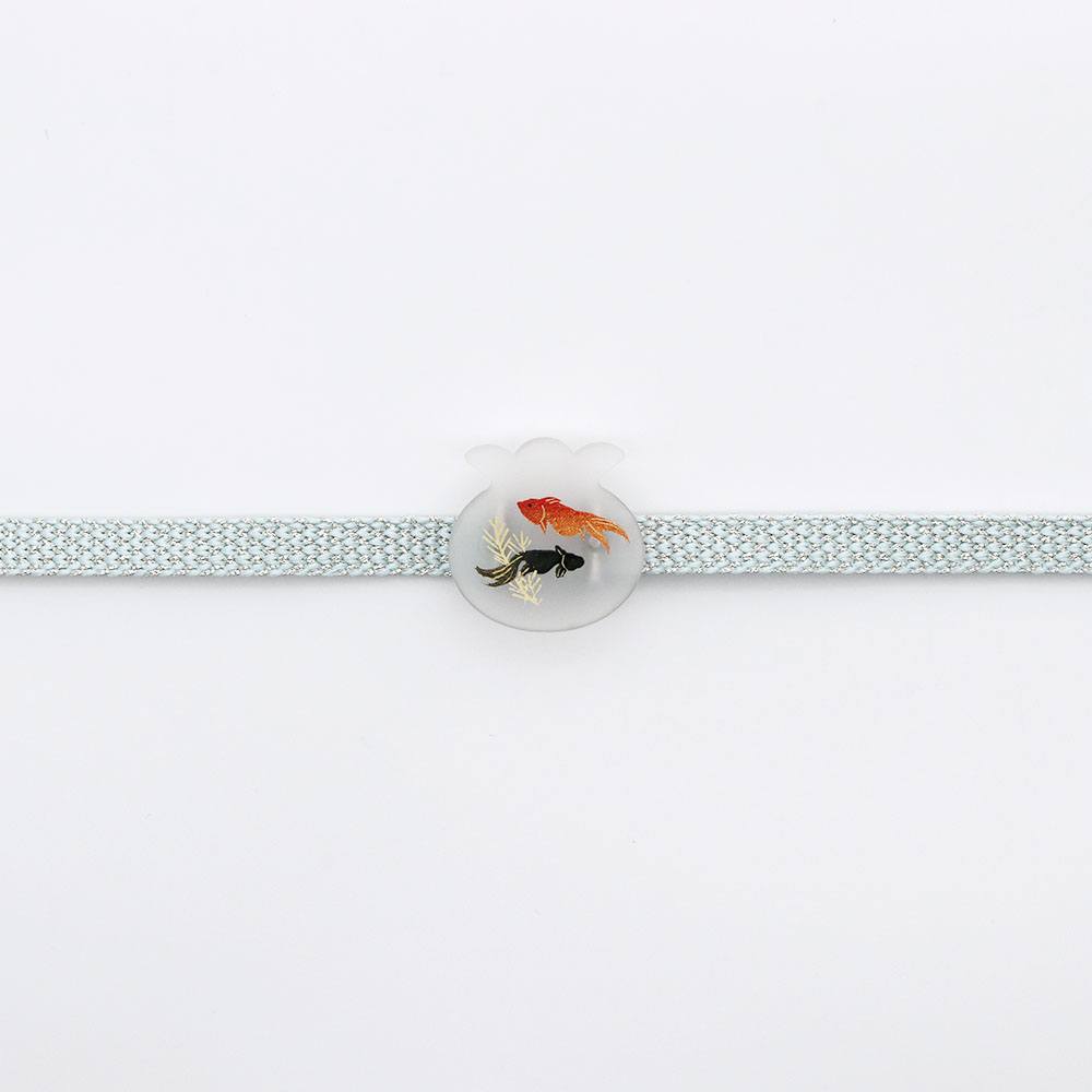 半透明の金魚鉢に、優雅に泳ぐ金魚たちを描いた涼しさを感じる帯留です。小ぶりのサイズで夏らしいコーディネートのアクセントにピッタリ。