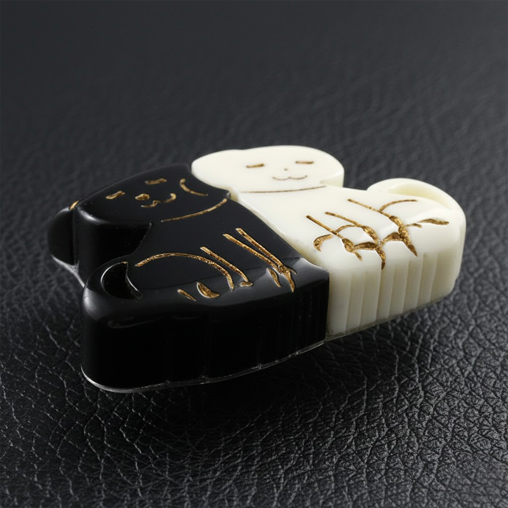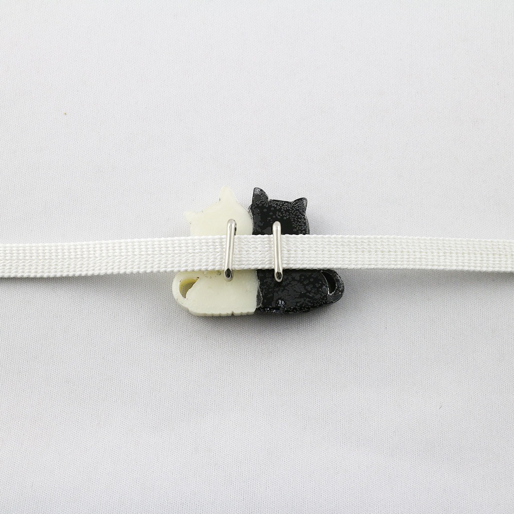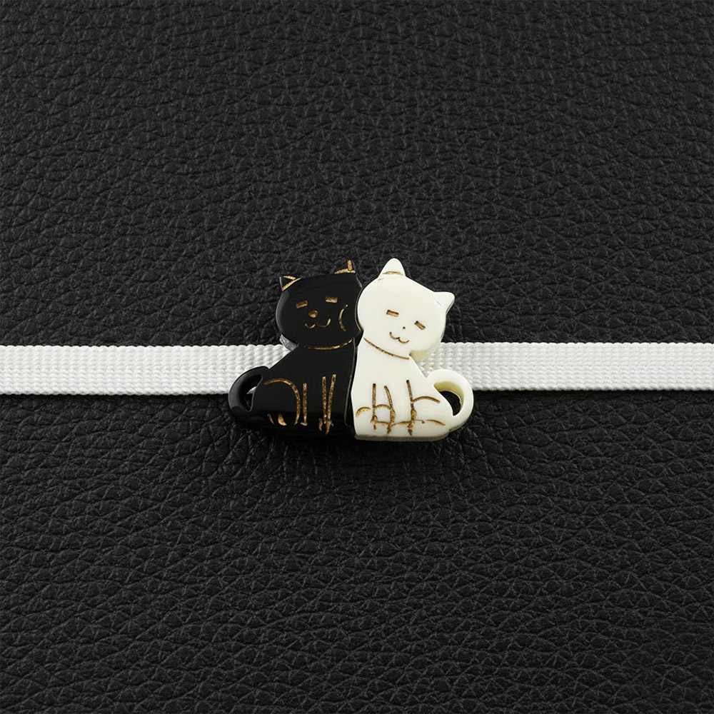 白黒で作られた仲睦まじい猫が描かれた可愛らしい帯留は、何かと重くなりがちな装いにも困らない軽い素材で仕上がっており、小物遊びにピッタリ。