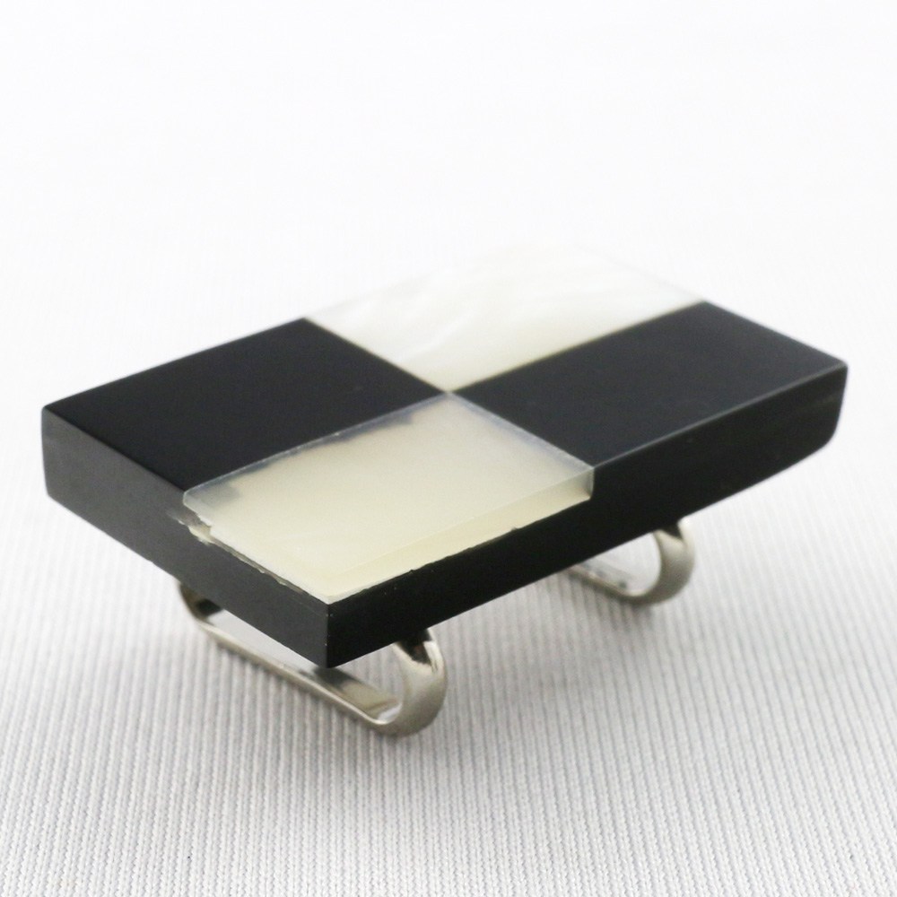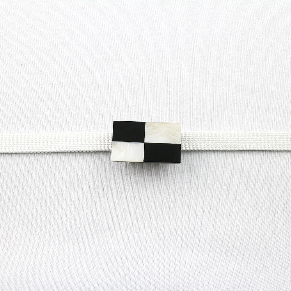 艶やかな光沢が美しい螺鈿を格子柄にしたモダンな帯留。光を浴びると様々な彩りで輝きます。見る角度によって色合いが変化していくのも螺鈿の上品さのポイントです。