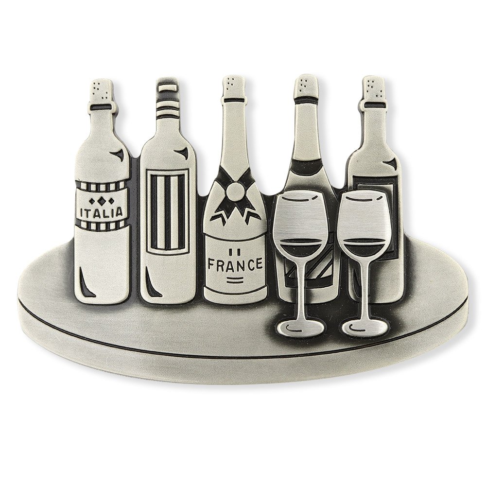 ワインボトルとワイングラスをモチーフにした帯留です。磨き抜かれた真鍮製ならではの落ち着きあるマットな光沢も相まって、和装姿にしっかり馴染んで個性を表現してくれるアイテム。経年により渋さが増してくるのも真鍮の味わいを感じさせてくれます。